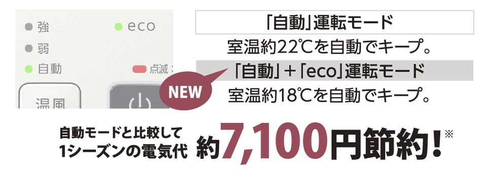 - NEW【自動】+【eco】 室温が18℃になるように「強」「弱」を自動で切り換えて運転します。室温が上がりすぎたときは、送風のみの運転に自動で切り換えます。