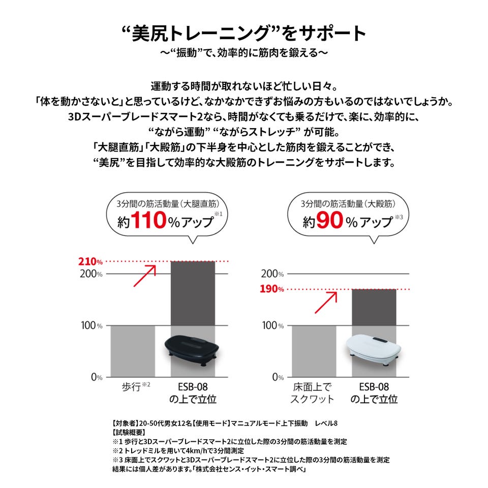 ※3 床面上でスクワットと3Dスーパーブレードスマート2に立位した際の3分間の筋活動量を測定