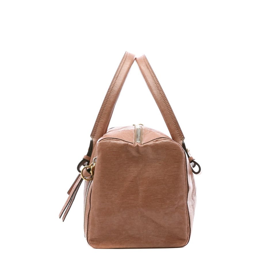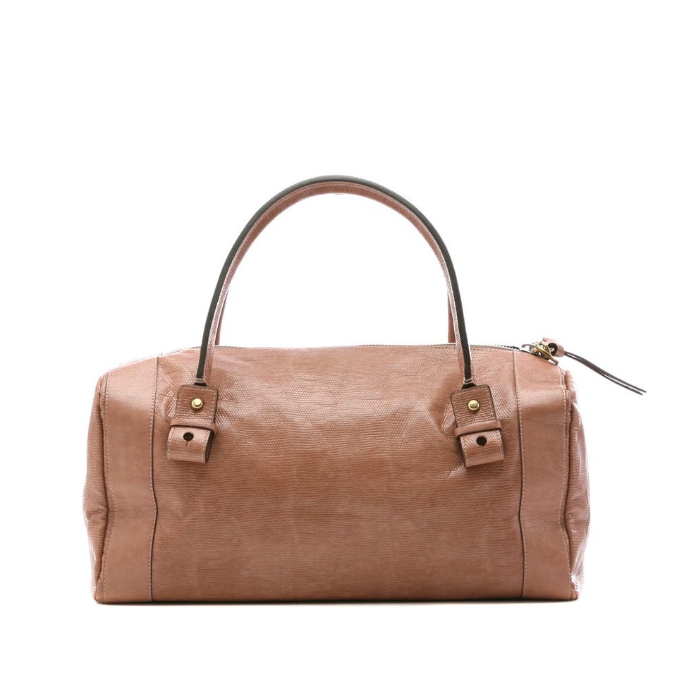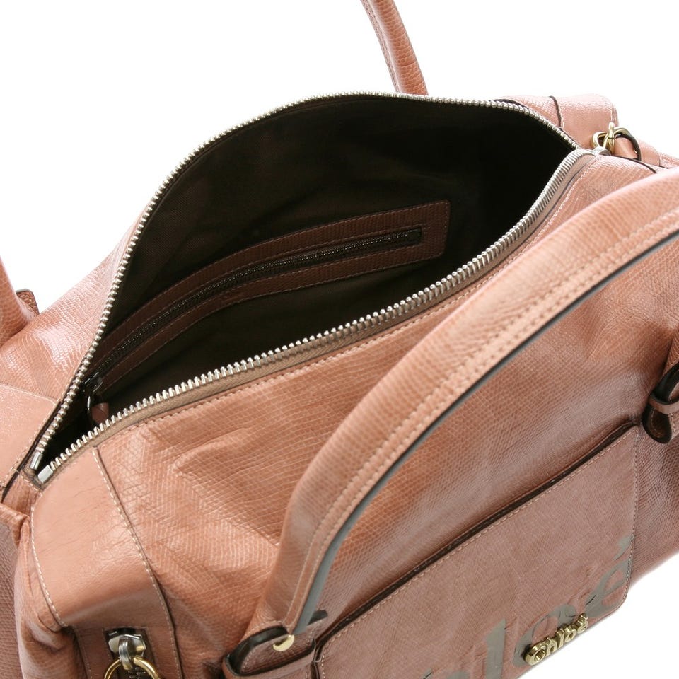 ‘エクリプス’シリーズのハンドバッグは、フェミニンなピンクベージュのコーティングが魅力。メタリックプリント、型押し、モチーフと3パターンで表現した「CHLOE」のブランドロゴもポイントです。