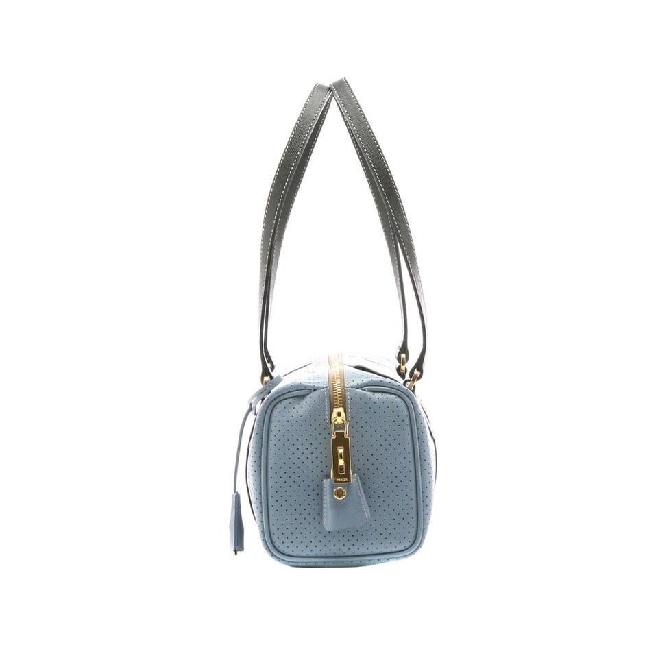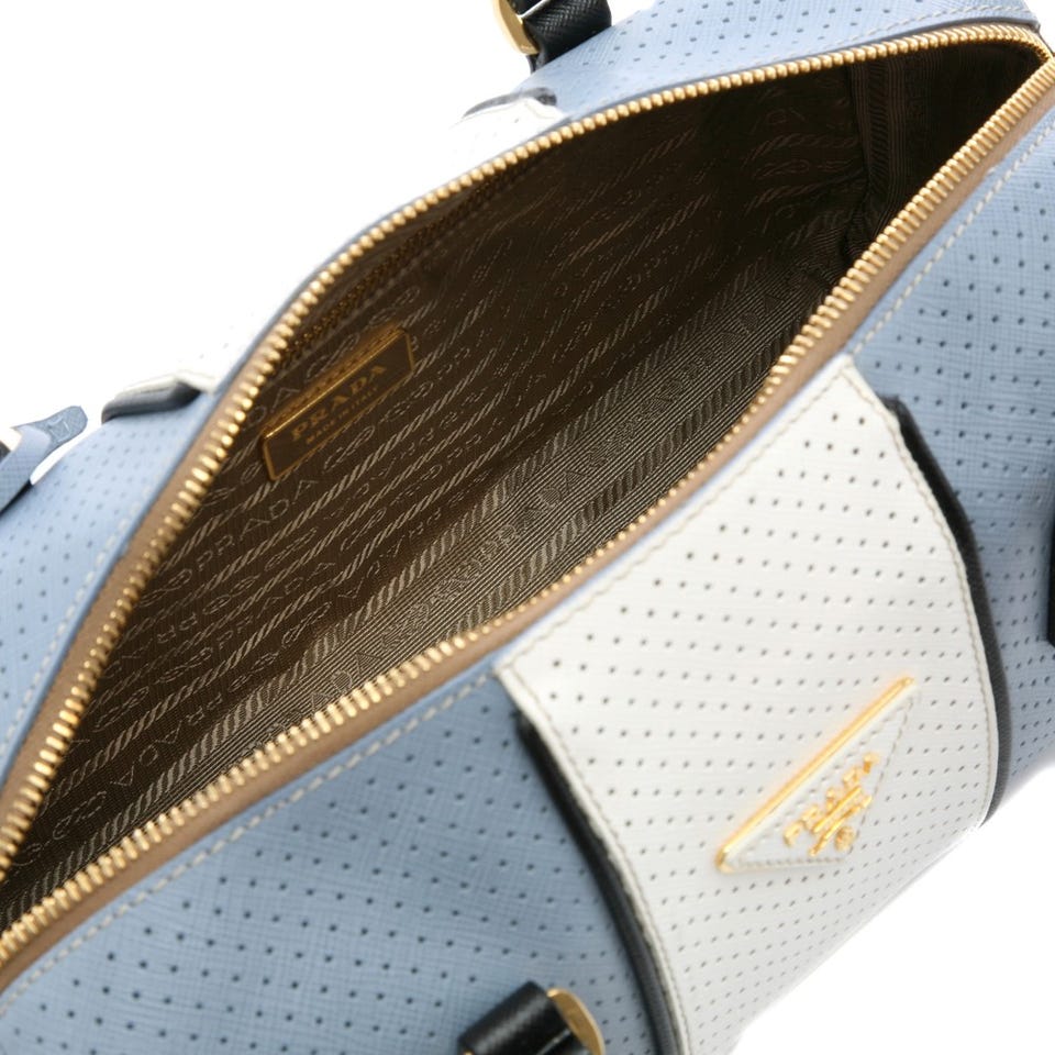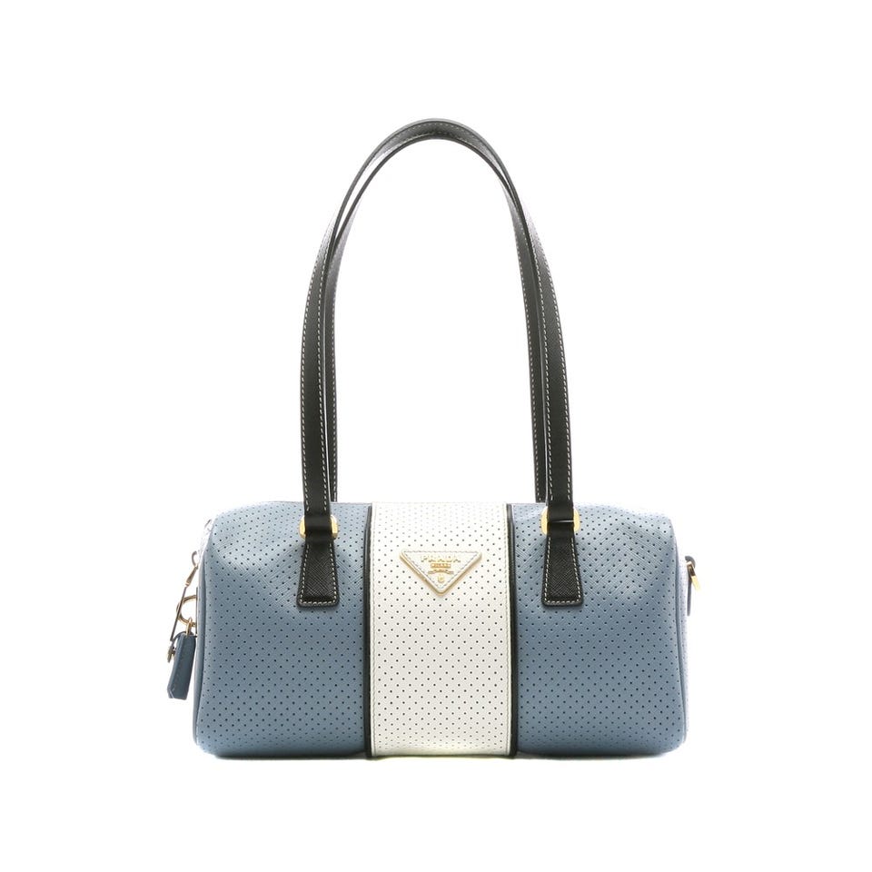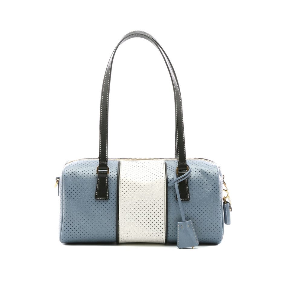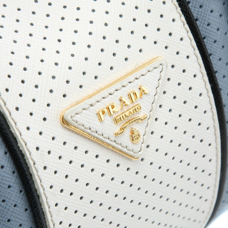 「PRADA」春夏コレクションのひとつである、パンチングレザーのショルダーバッグ。アイスブルー×ホワイトのバイカラー配色が爽やかな印象。小ぶりなので、身軽でいたいショッピングなどに最適。