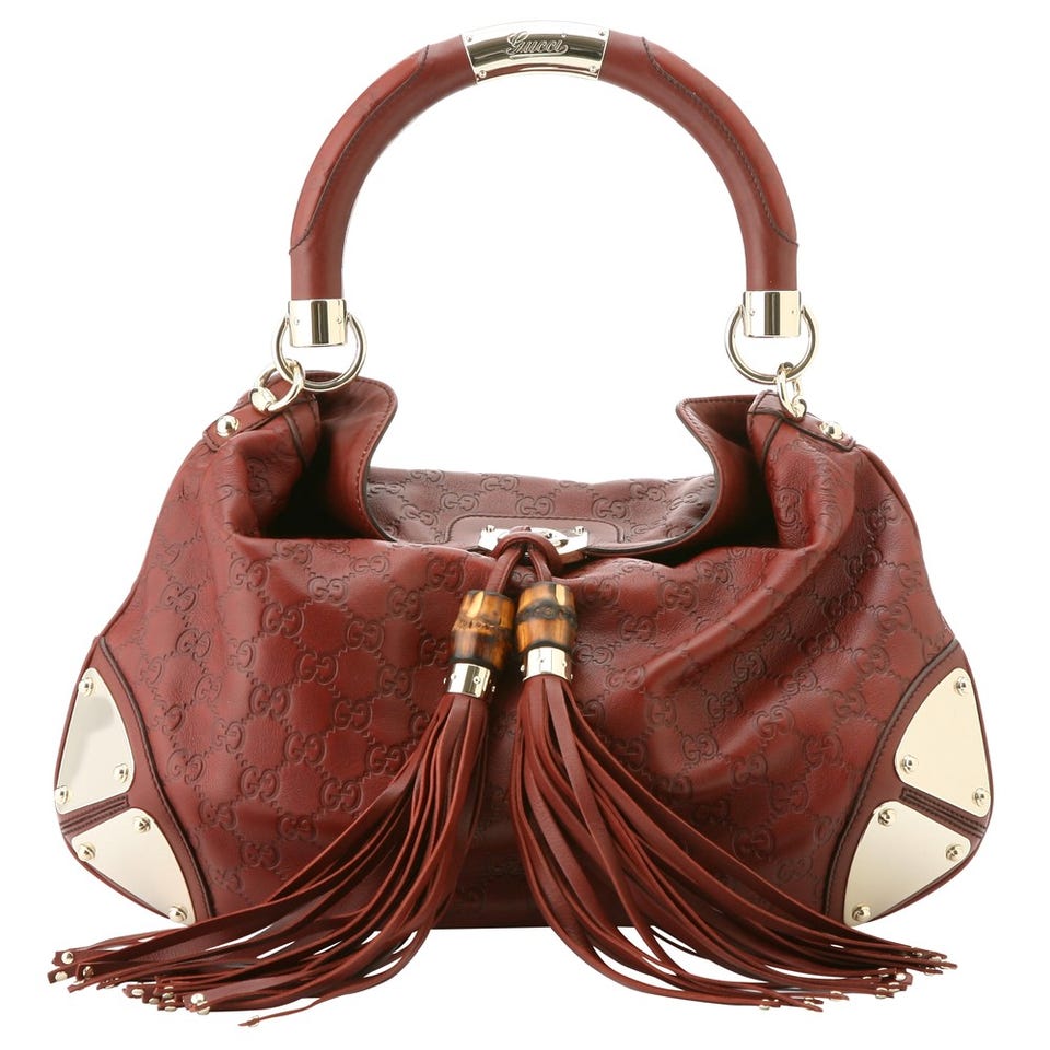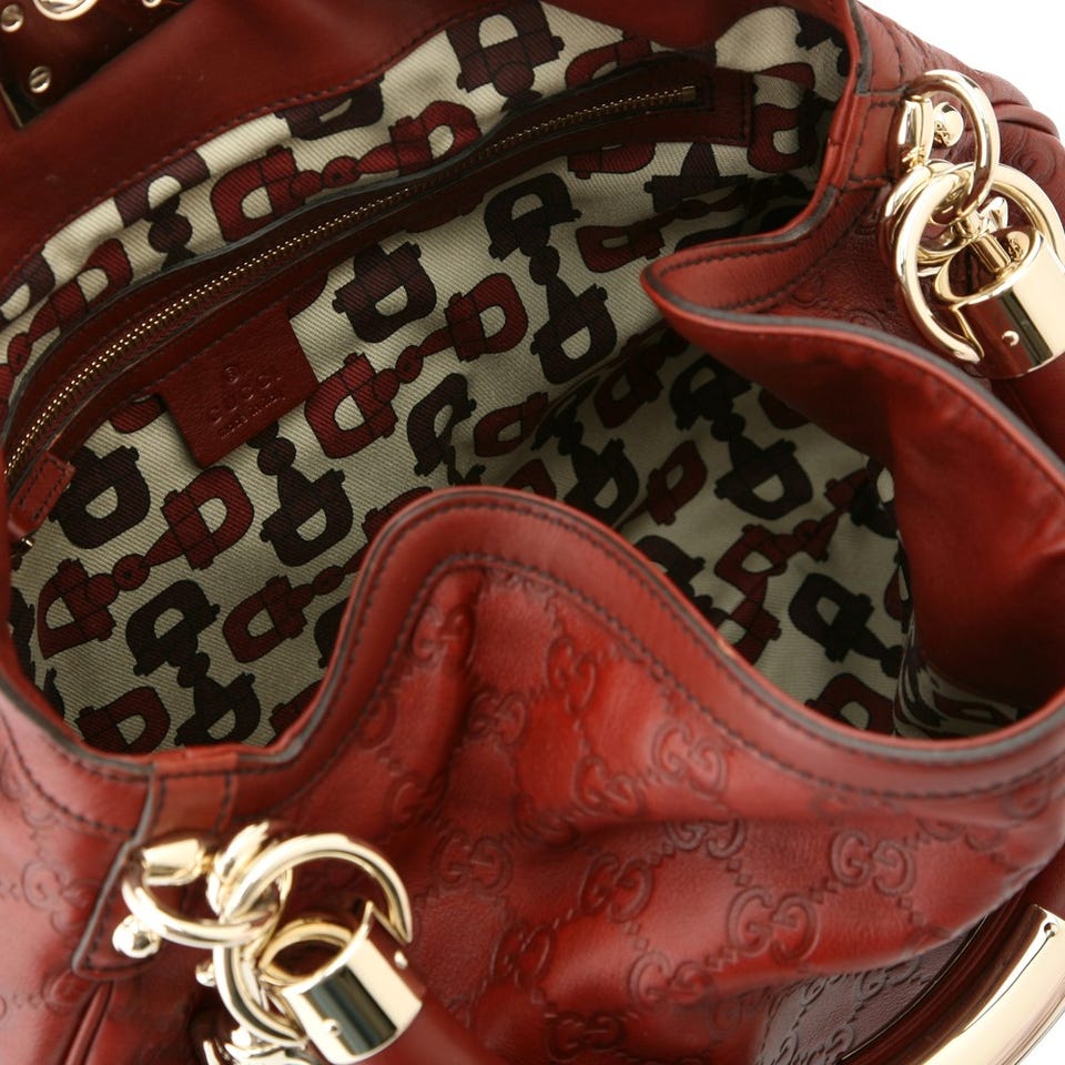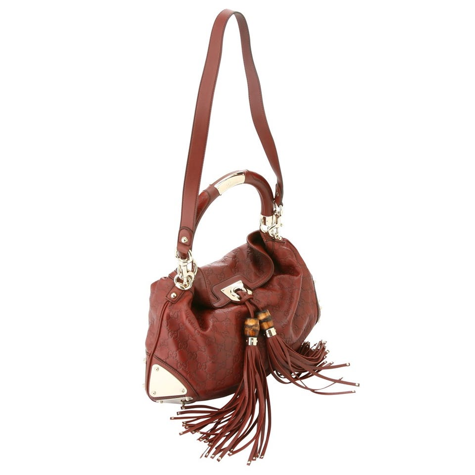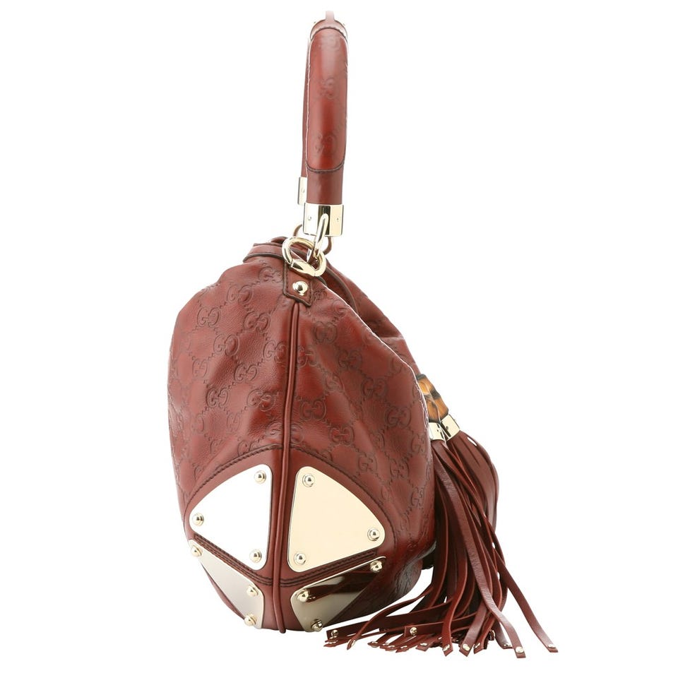 GG柄のエンボス加工が特徴である、グッチシマレザーを用いたショルダーバッグ。バンブー付きのタッセルや、ホースビット柄のライニングなど、随所に「GUCCI」を象徴するモチーフがあしらわれています。