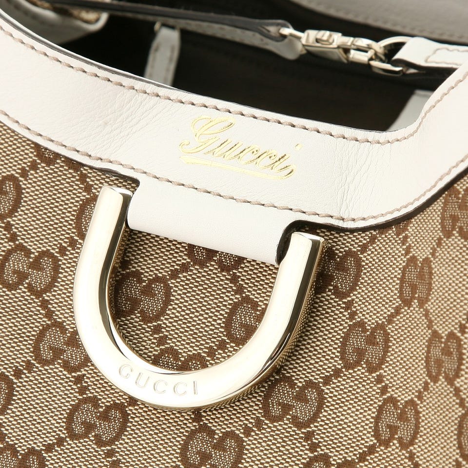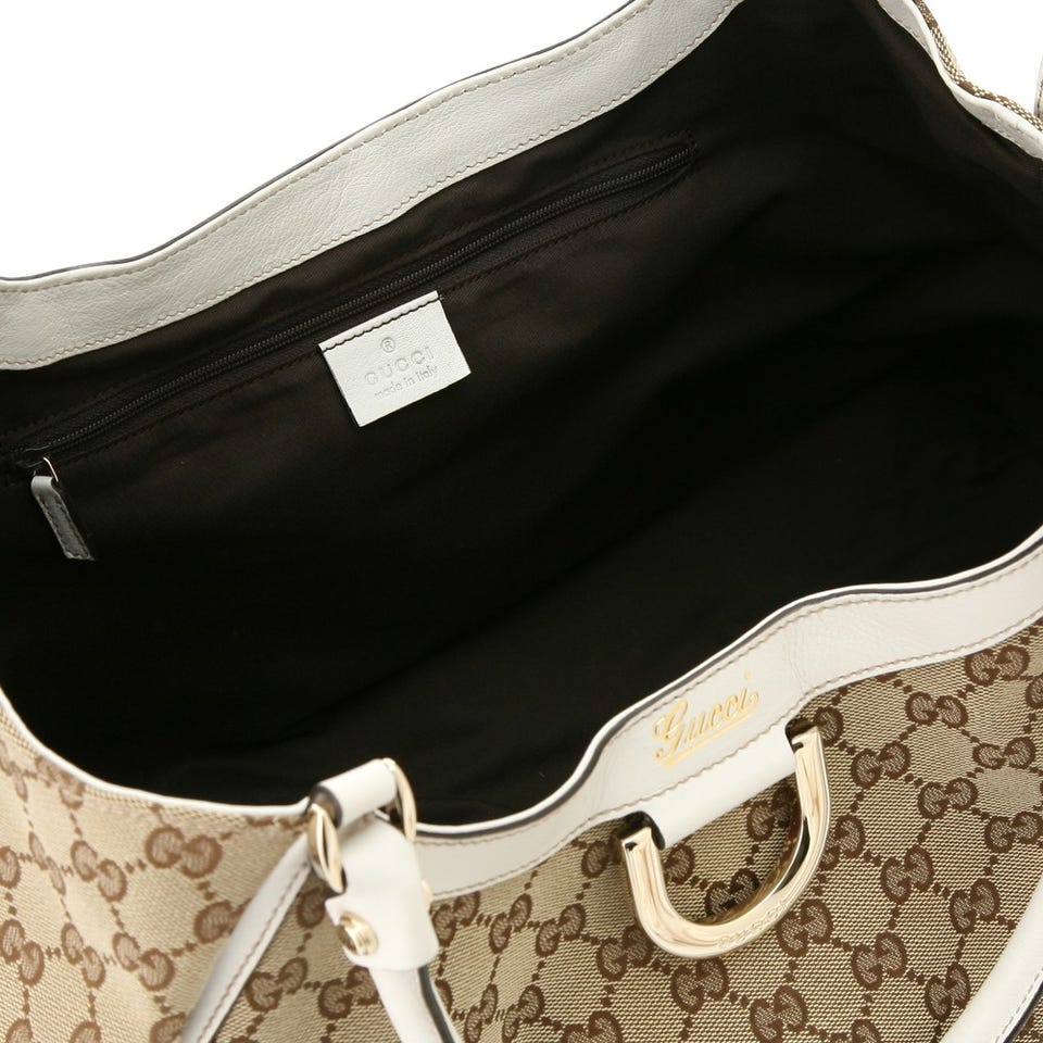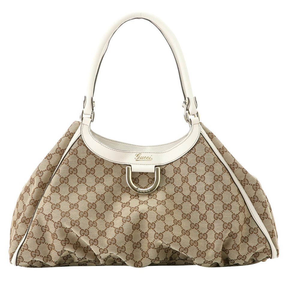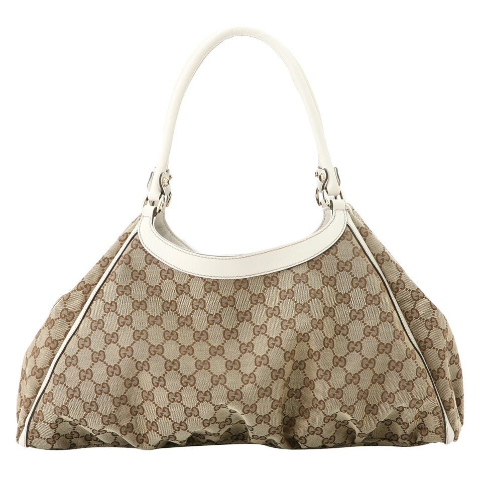 ホワイトのハンドル&トリミングが、爽やかなムードを放つショルダーバッグ。「GUCCI」おなじみのGG柄ファブリックとのコンビネーションも絶妙。マチ幅が大きいので収納力にも優れています。