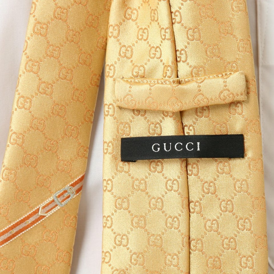 「GUCCI」定番のGG柄が全面にあしらわれたネクタイ。明るいイエローが華やかな印象を与えます。小剣部分に配されたベルトのデザインも見逃せないポイント。シルク素材なので肌触りも格別。