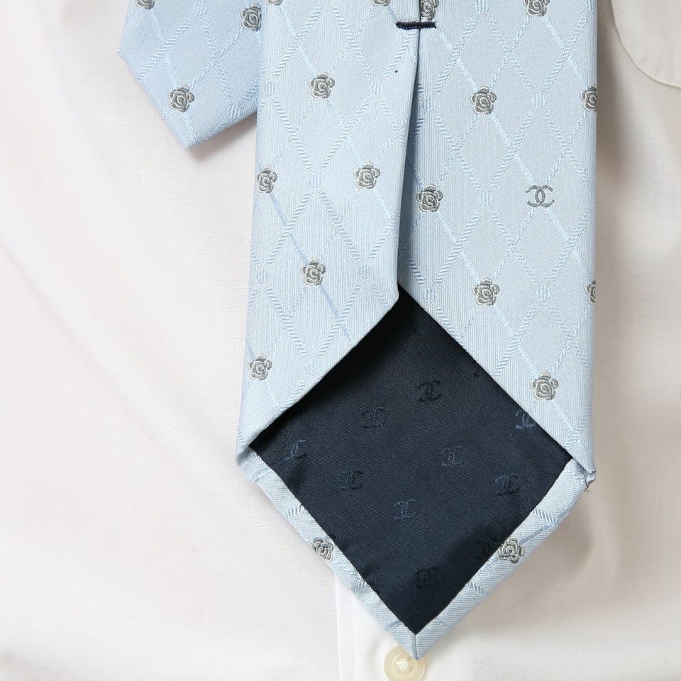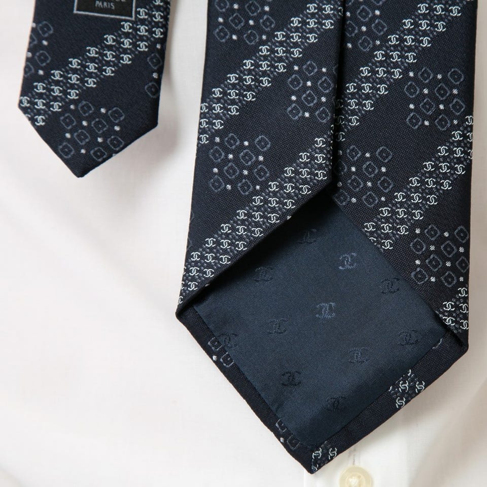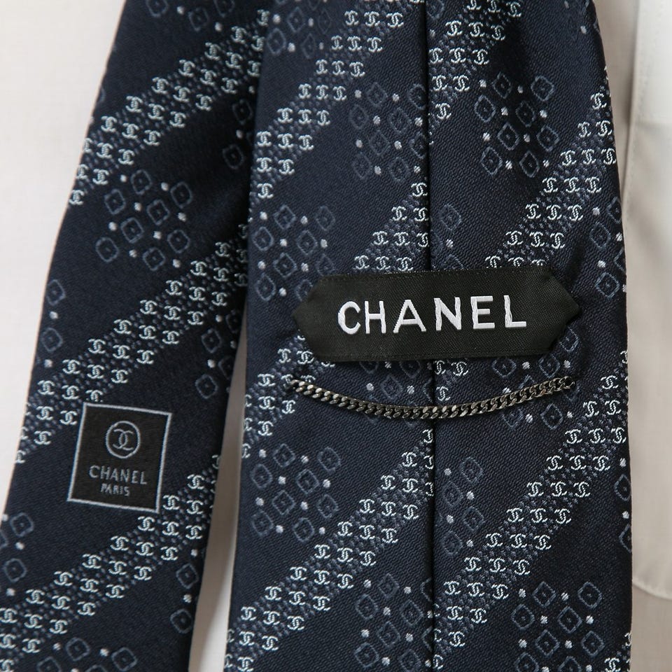 ちょっぴり個性的な「CHANEL」のネクタイ。スーツスタイルを引き締めるアクセントとして活躍してくれます。シルク素材なので、襟元にしなやかにフィットします。