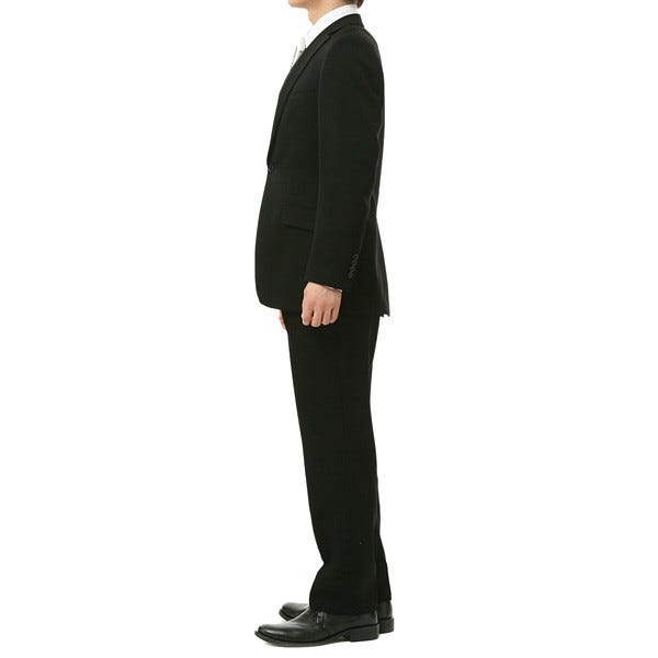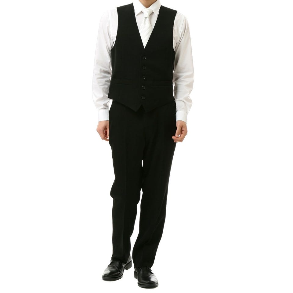 冠婚葬祭に欠かせないブラックスーツシングルタイプのジャケット、ベスト、パンツの3点がセットになっています。