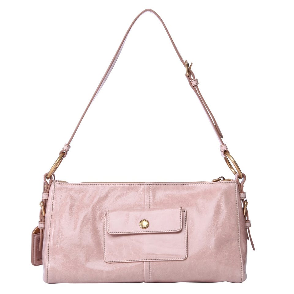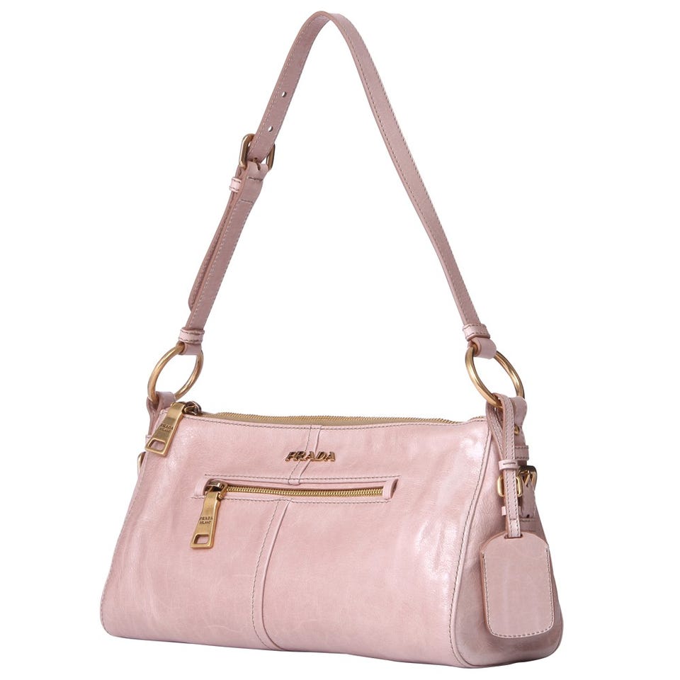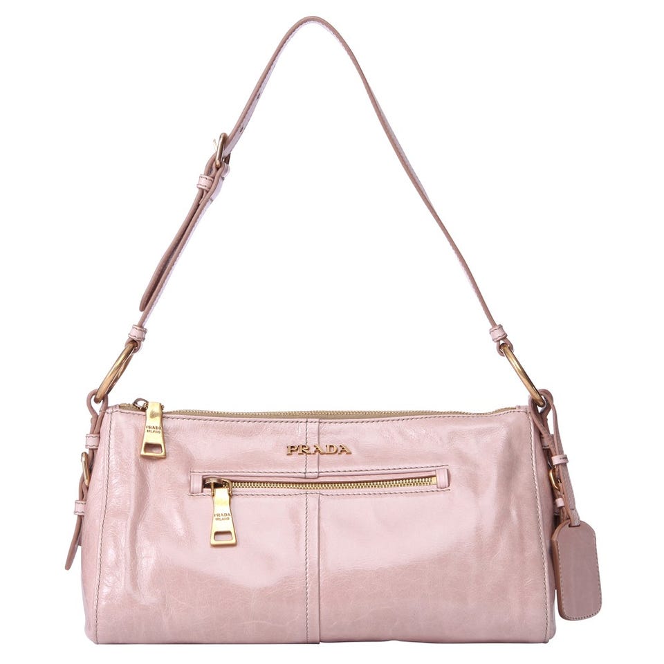 「PRADA」のハンドバッグ‘VITELLO SHINE’。ベビーピンクのレザーがフェミニンな印象を与えます。大きめのファスナートップも愛らしいポイント。デイリーから結婚式まで、幅広いシーンで活躍してくれます。