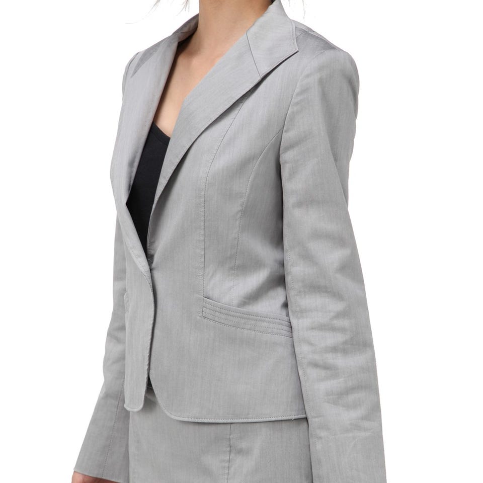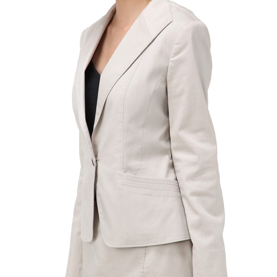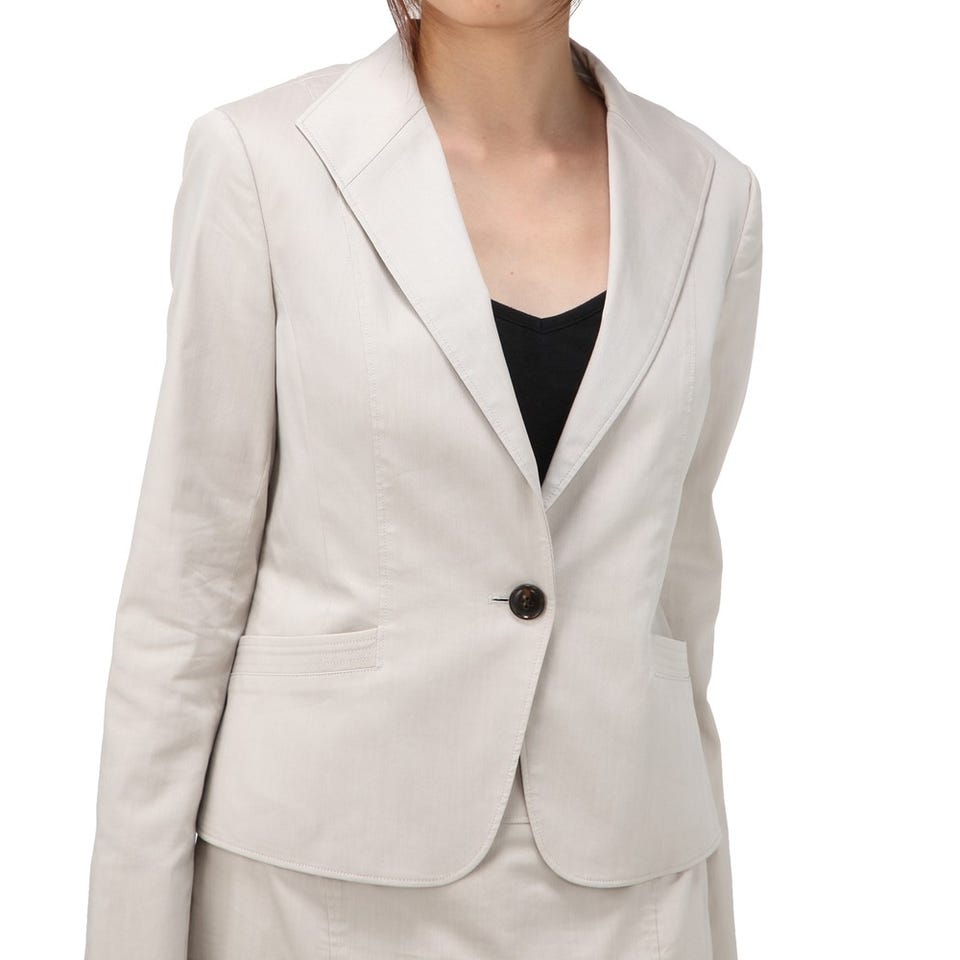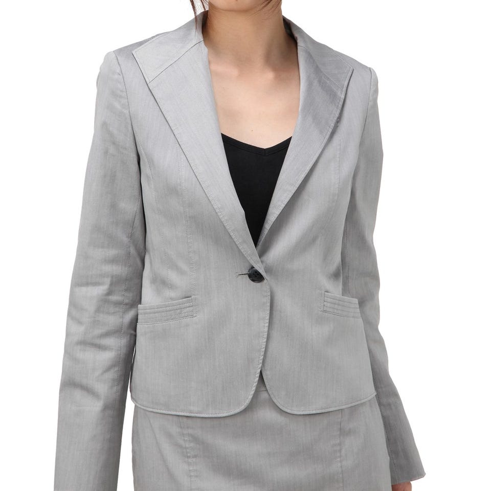 スタイリッシュな印象を与える「自由区」のスーツ。ボディラインをすっきりと見せる、ジャケットに配された斜めのポケット&スカートの切り替えがこだわりです。ベーシックなシルエットなので使いやすさも◎。