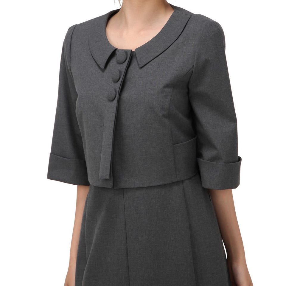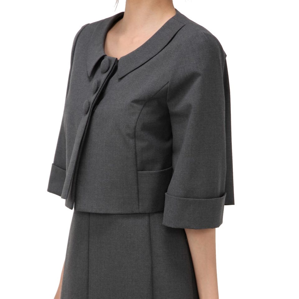 短めのジャケットがワンピースとの着こなしをバランスよく見せる「FOXY」のスーツです。ジャケットは、バックスタイルにタックが入っているので、動きやすさも◎。ワンピースのユニークな袖もお見逃しなく!