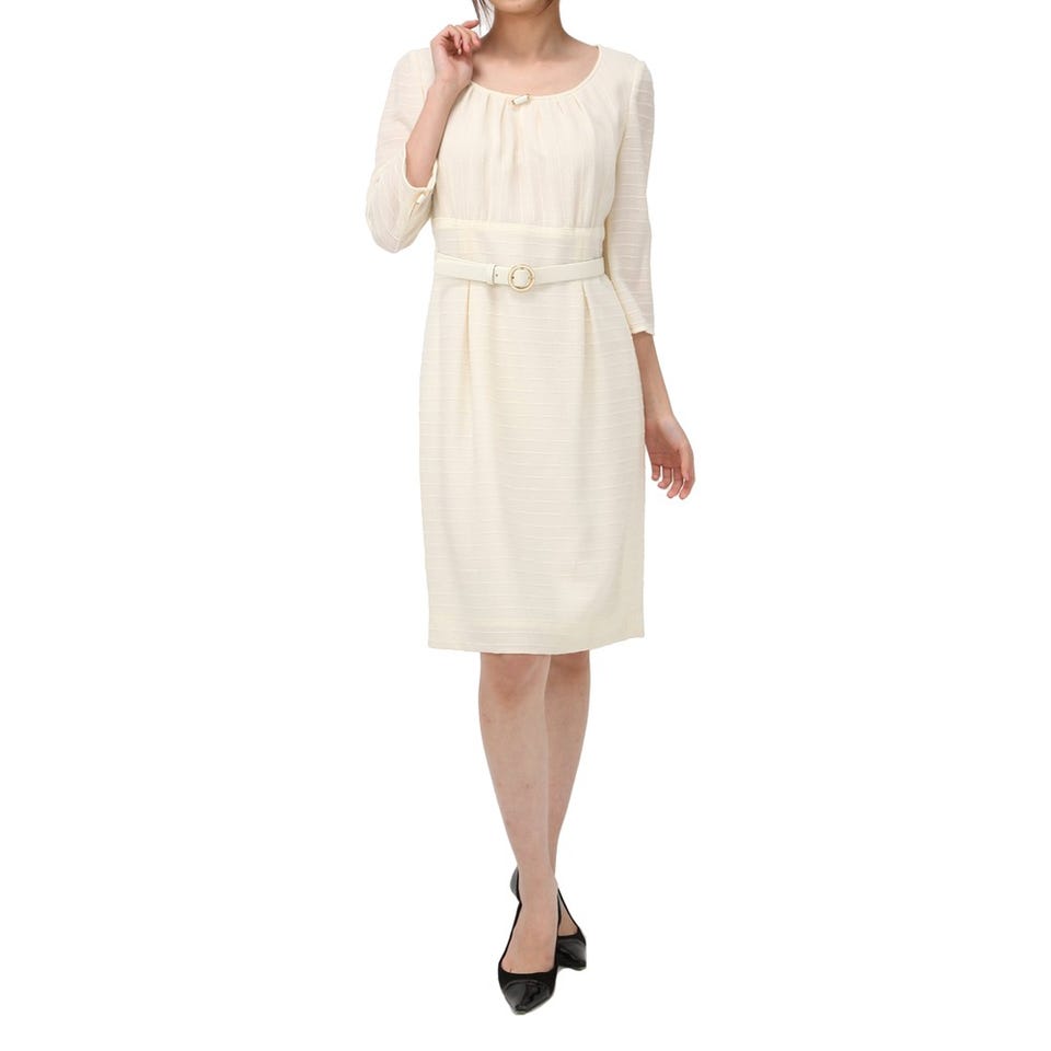 「miss ashida」春夏モデルのワンピーススーツ!ジャッケットはフサフサとした素材を織り込み、華やかなムードに仕上げています。ワンピースは丸いバックルのベルトがクラシカルな印象です。