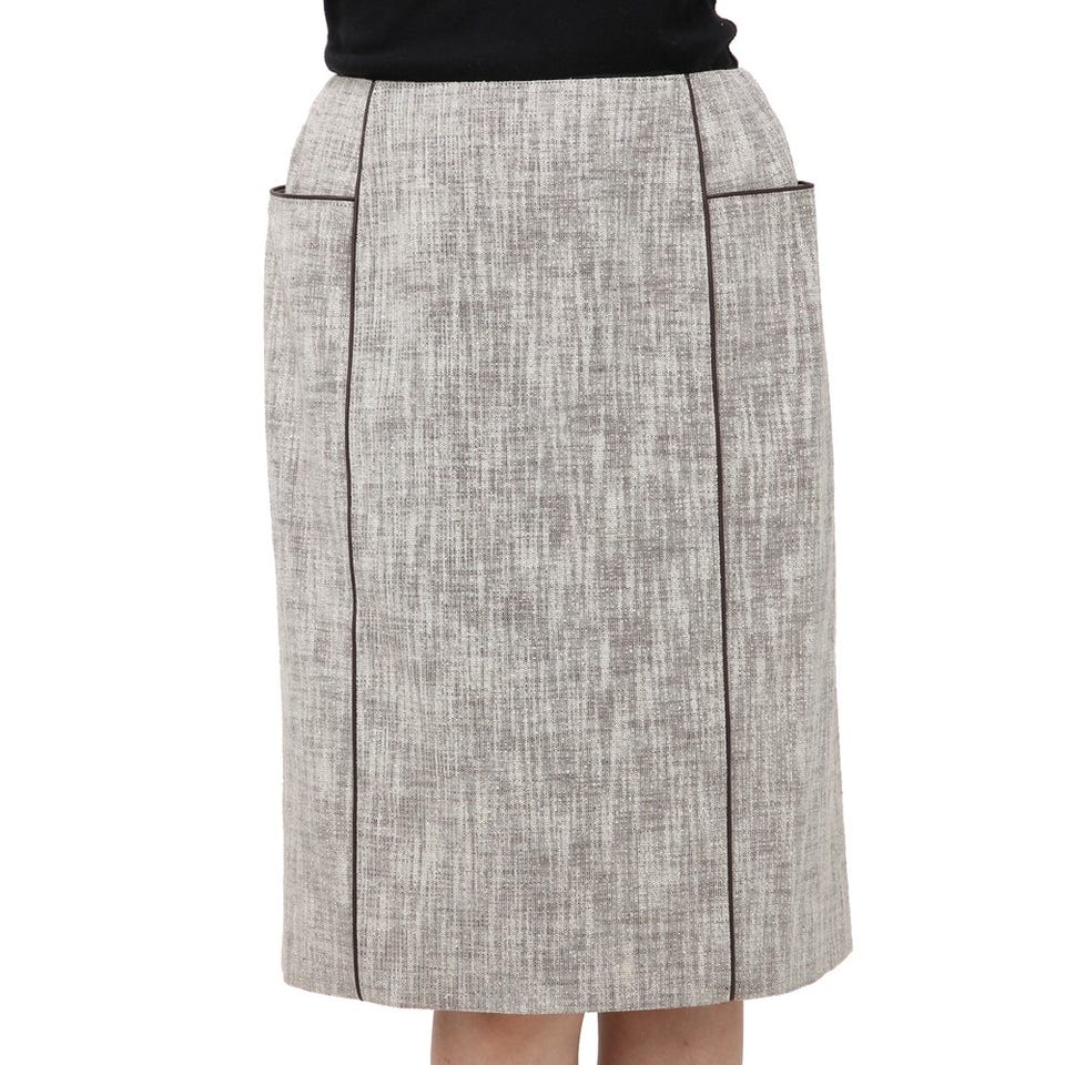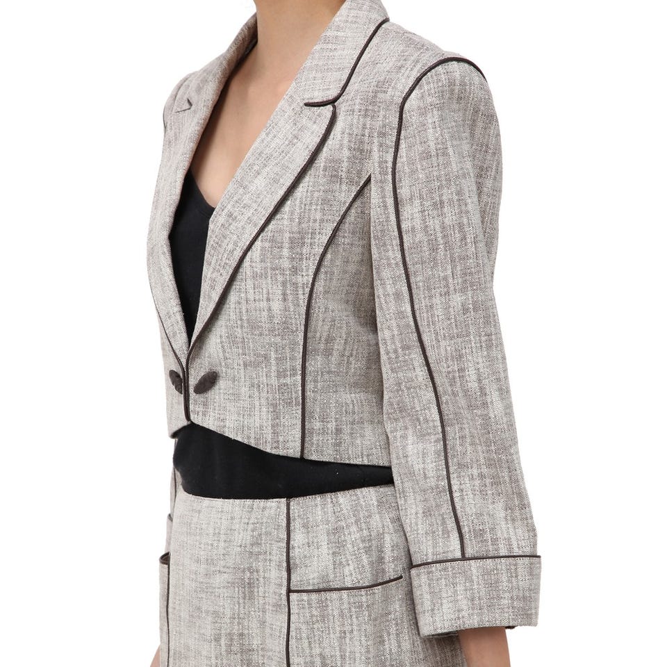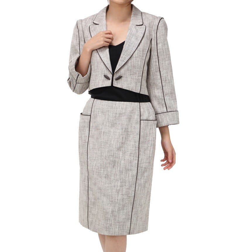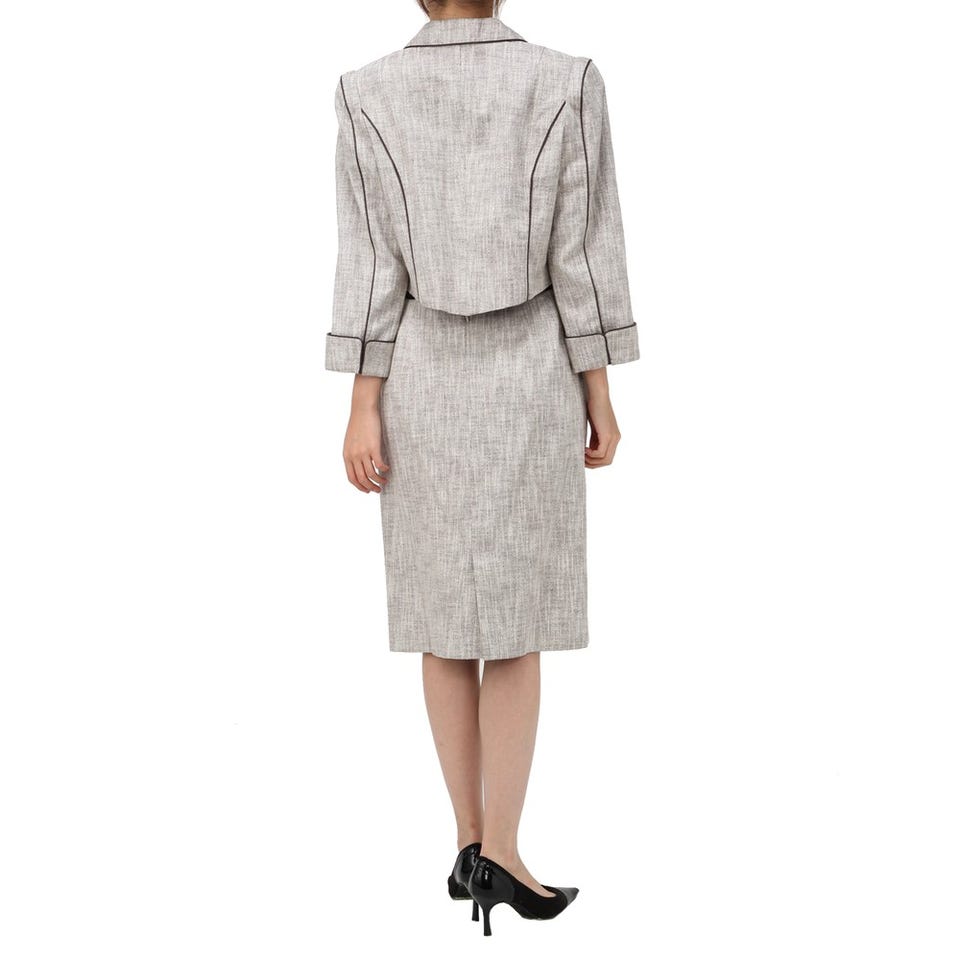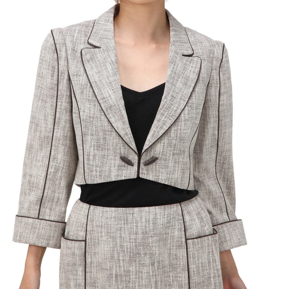 「miss ashida」のエレガントなスーツ。随所に施されたブラックのパイピングがアクセント。短い着丈のジャケットは、視線を高い位置に集めるので脚長効果に期待大。ミディ丈のスカートは上品な印象です。