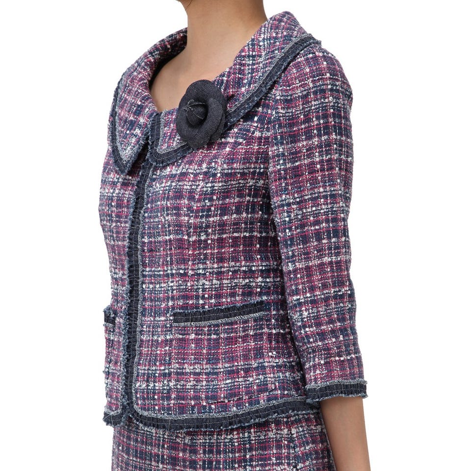 紫にも似た濃いピンクベースのチェック柄がフェミニンな印象を与えるレディーススーツ。ジャケットにはデニム素材のトリミングを施し、カジュアルなニュアンスをプラス。大きな襟にマッチするコサージュが付いているので顔映りも華やかさを演出します。