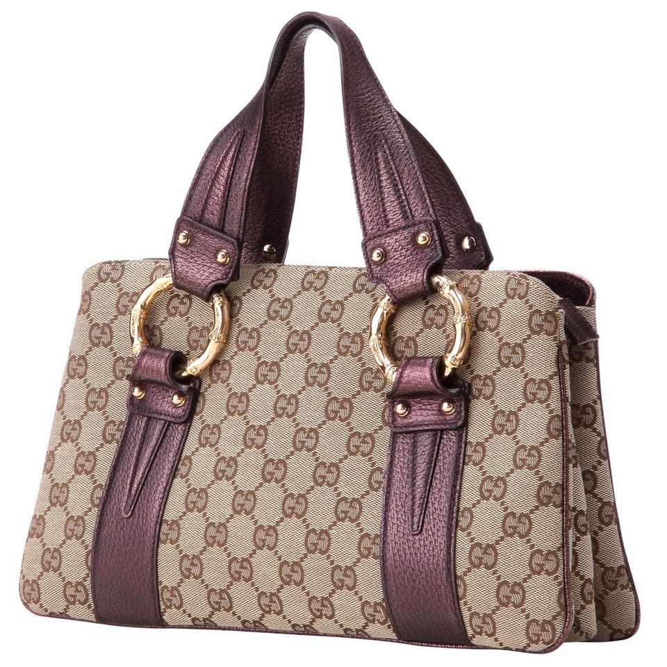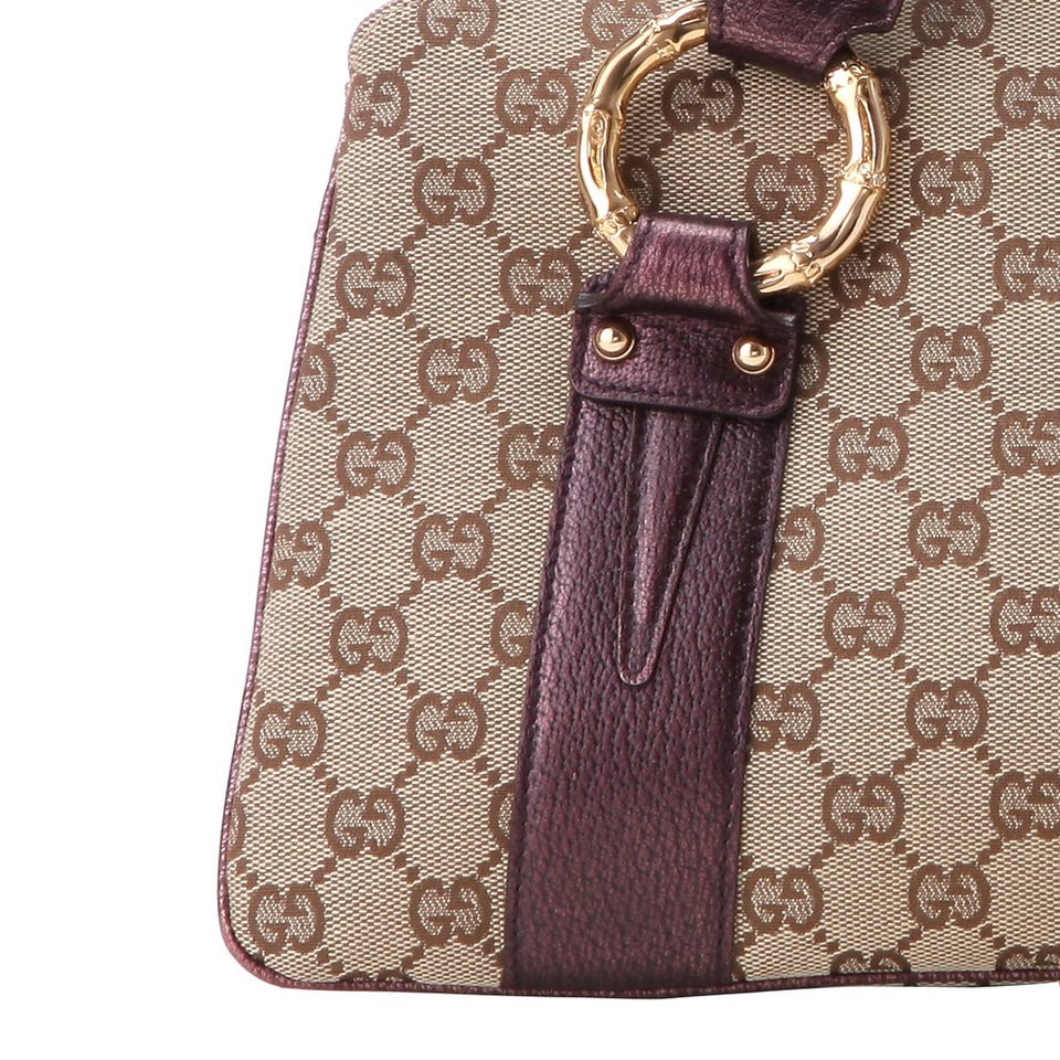 「GUCCI」おなじみのGGキャンバスを用いたハンドバッグ。パープルのレザーがスタイリッシュなアクセントに。バンブーを象ったゴールドのリングにも注目を。内側には仕切りポケットがあり、使い勝手も◎。