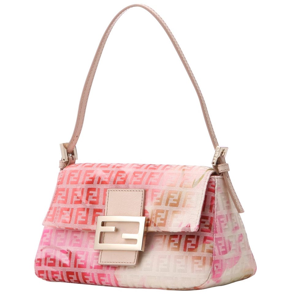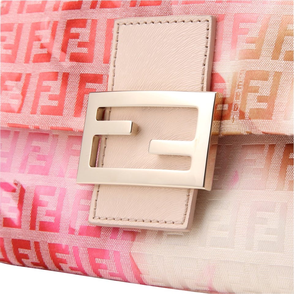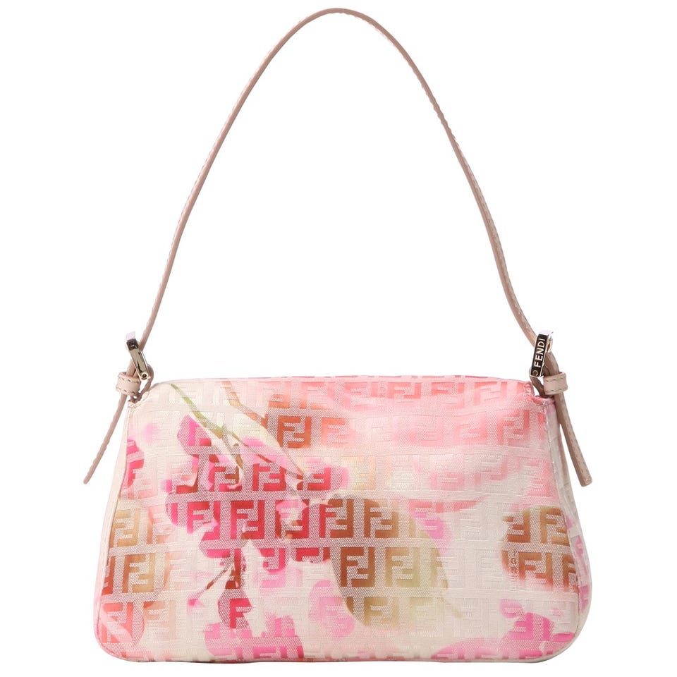 「FENDI 」定番のズッカ柄ファブリックにフラワーモチーフがぼんやりと浮かび上がるハンドバッグ。パステルで色付けしたような淡いカラーリングも魅力。小脇に収まるサイズと華奢なハンドルはスマートな印象を与えます。