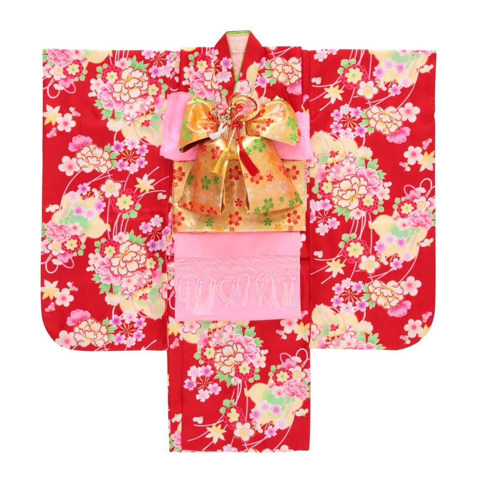 定番の赤地のお着物に、大きく描かれた満開牡丹が煌びやかな着物セット。金色地に桜模様の小物類が、お子様を一層、華やかに彩ります。