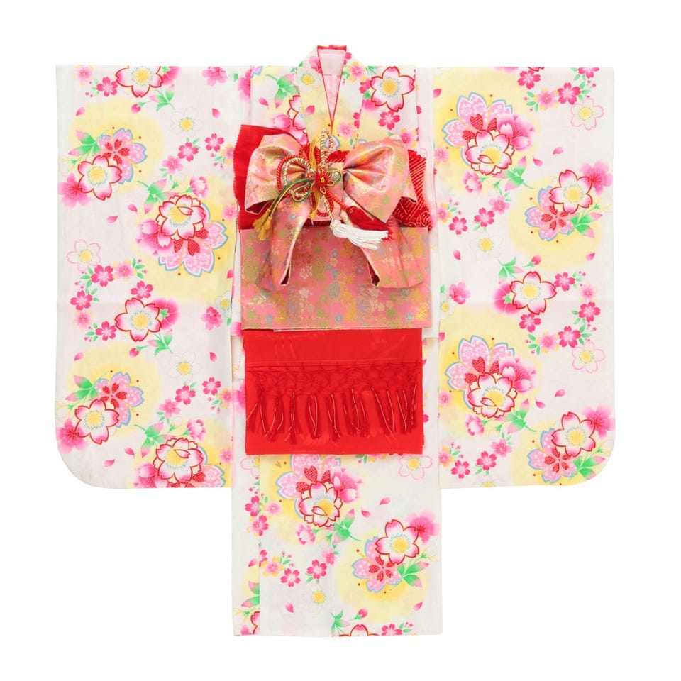 白地に黄色のぼかしがふんわりと優しい印象を与える着物セット。着物に描かれた大輪の桜や、落ち着いたピンクの帯が愛らしさをプラスします。