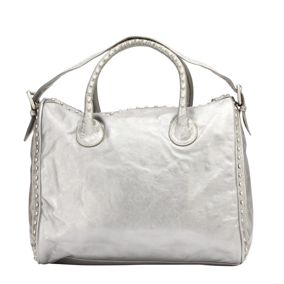 シルバーのレザーがクールなきらめきを放つ「MARC BY MARC JACOBS」のショルダーバッグ。リズミカルに並んだスタッズがスパイシーなアクセントに。長いフリンジチャームも目を引くポイントです。