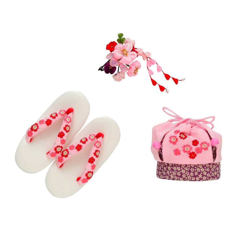 ・着物・長襦袢(半衿つき)・被布コート・兵児帯(しごき)・腰ひも2本・足袋・肌襦袢・髪飾り・巾着・草履