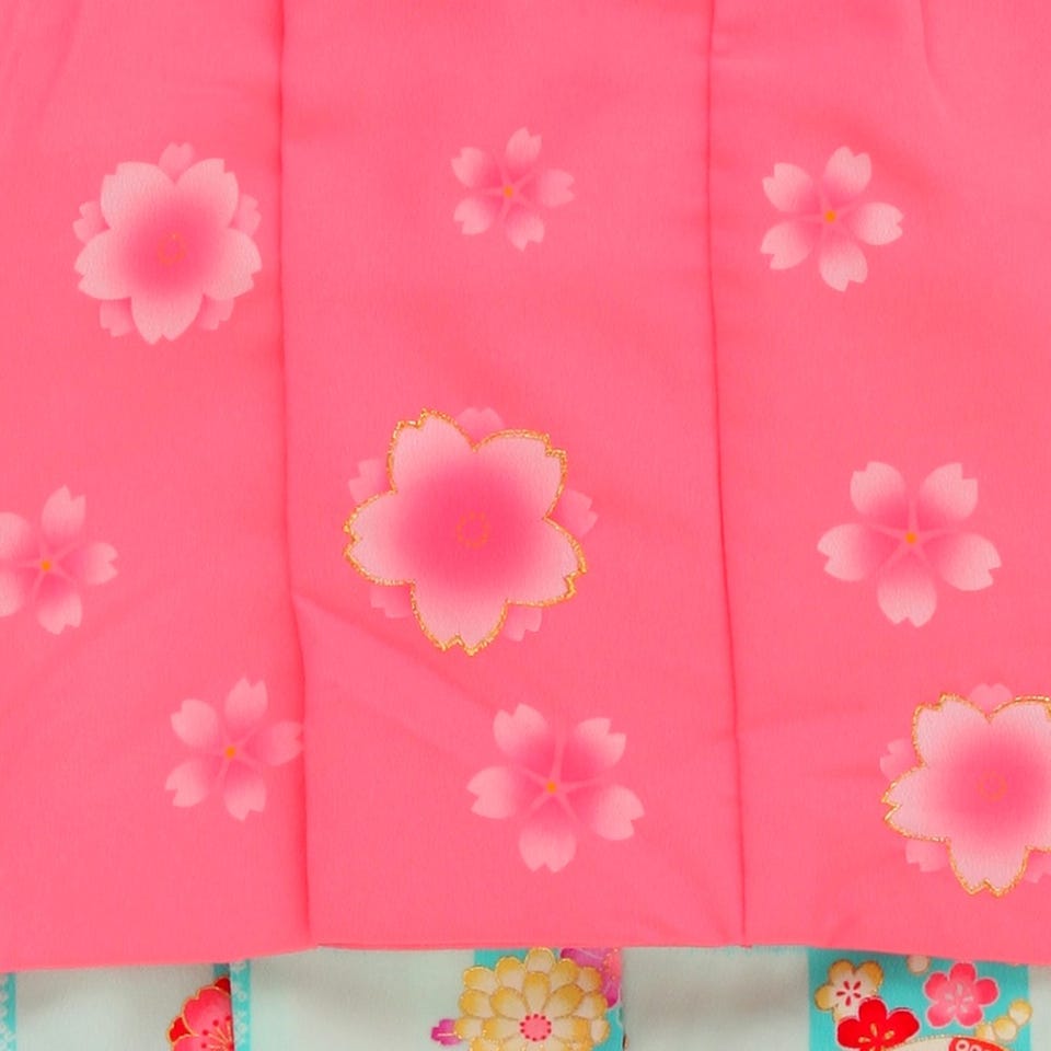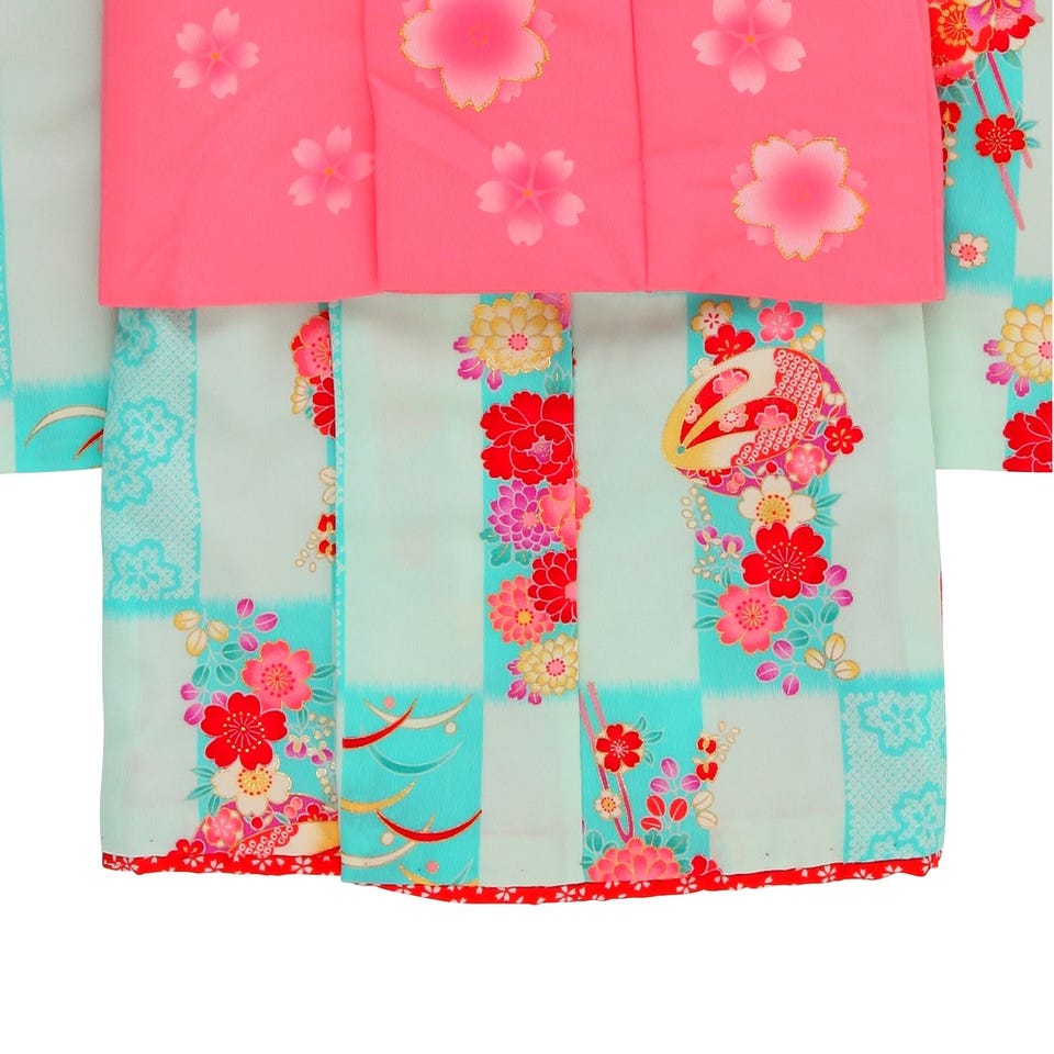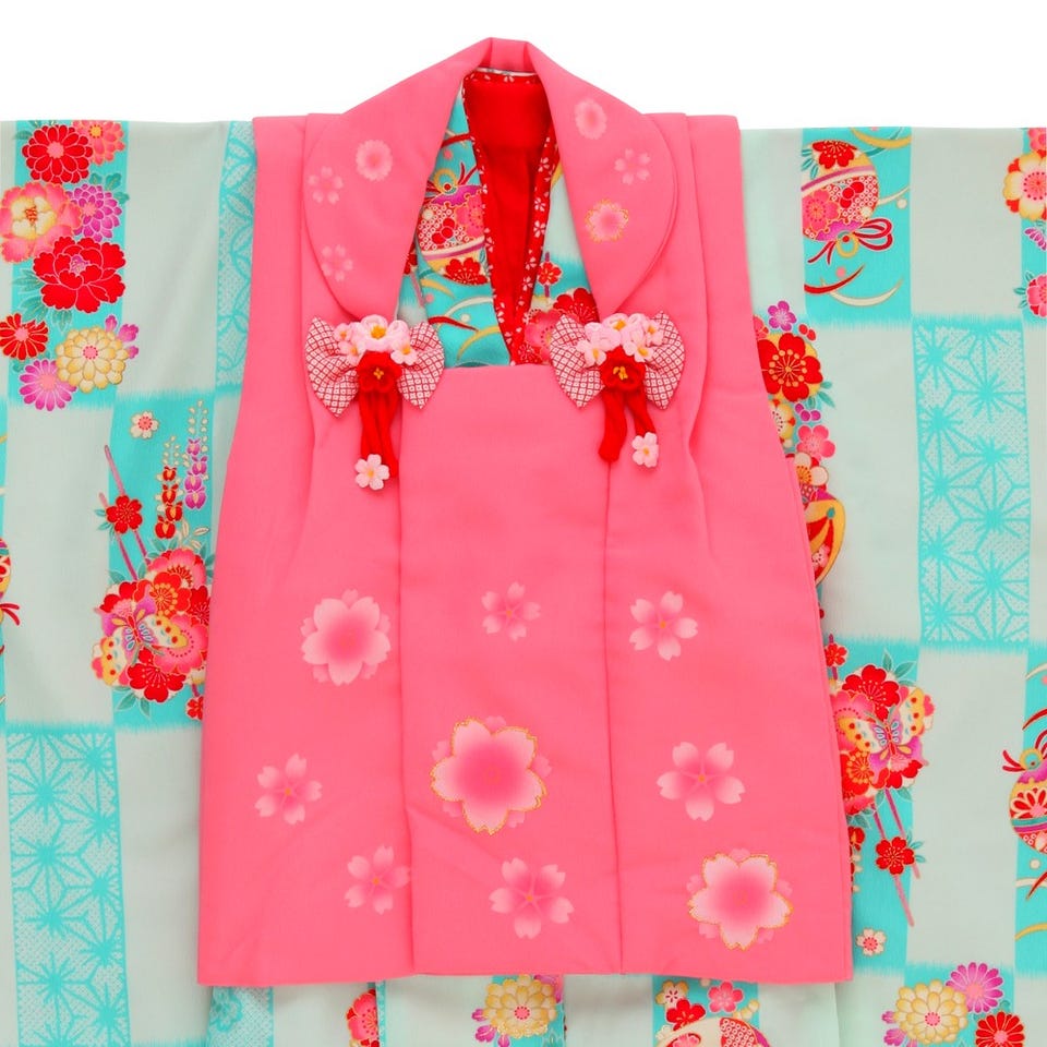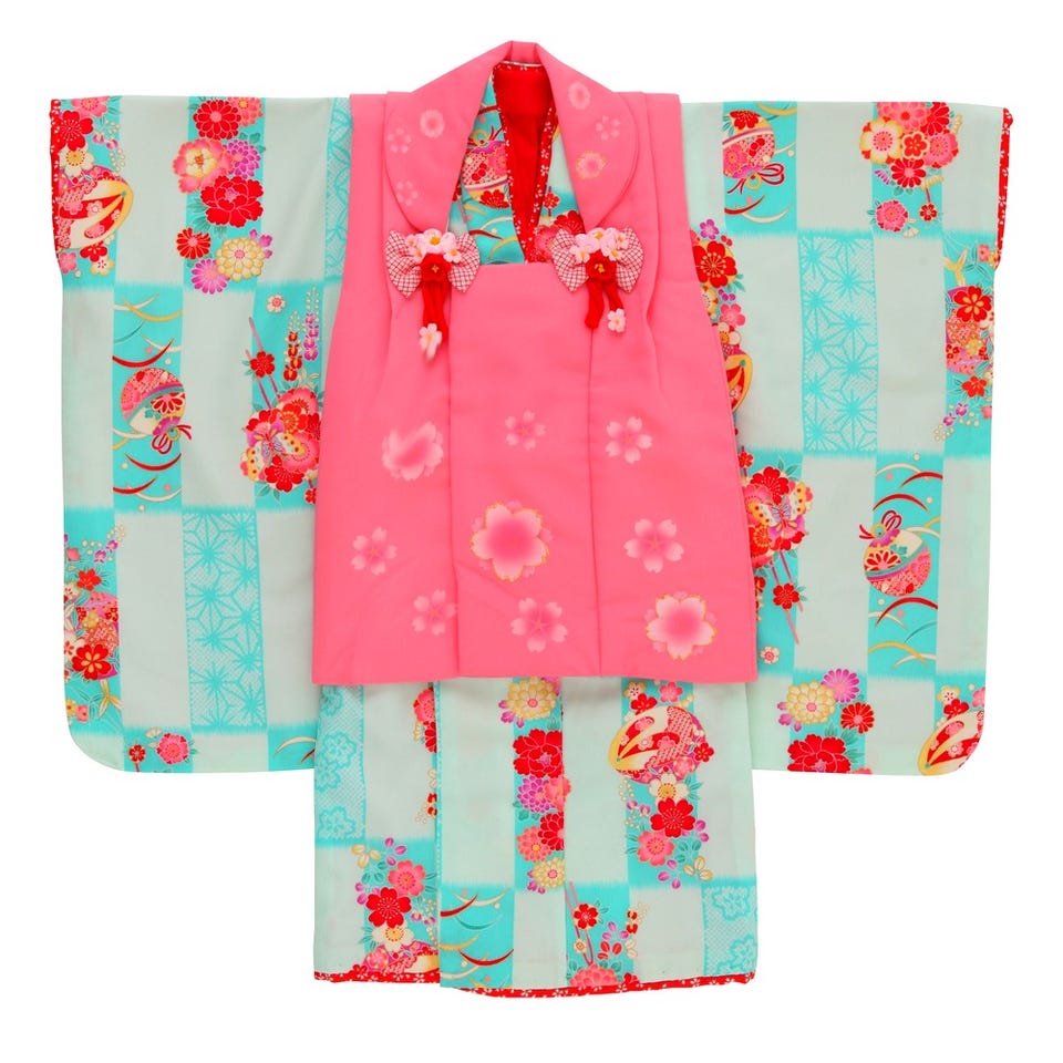 花夢二ブランドの七五三3歳用被布セット!爽やかな水色地と淡い水色地の市松模様のお着物にピンクの被布コートが三歳児らしい愛らしく元気いっぱいな印象の被布セット。手鞠や草履、赤・紫・黄色の花々の古典模様が鮮やかに散りばめられ、とっても可愛い一品。