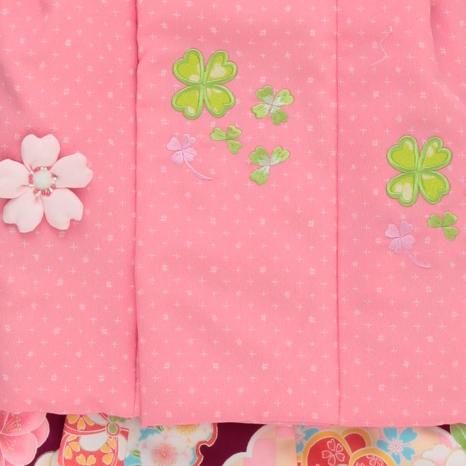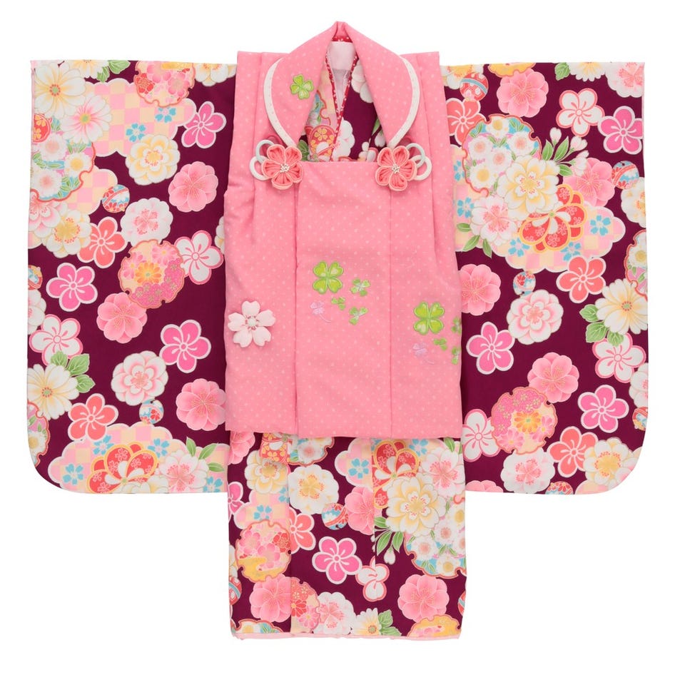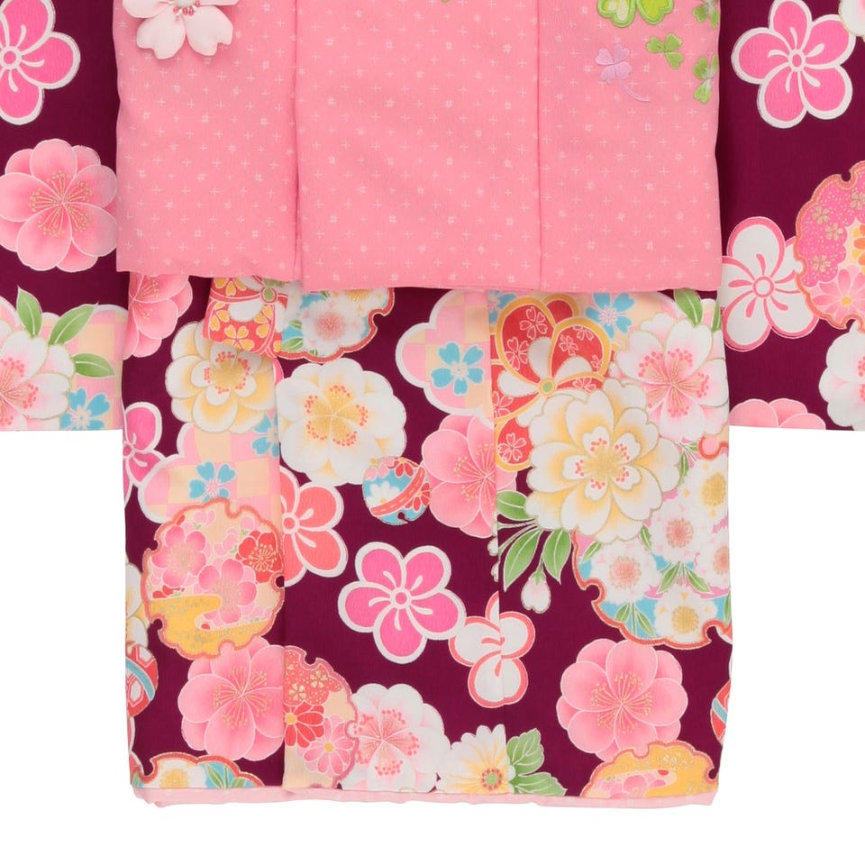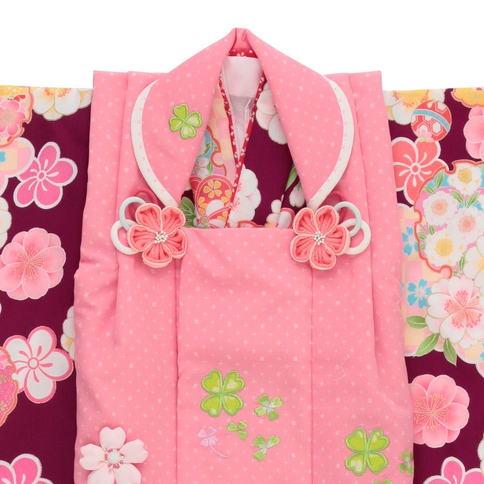 紫地にピンクの花々や雪輪模様がちょっとお姉さんな雰囲気のある上品で愛らしい被布セット。四葉のクローバーの刺繍のはいったピンクの被布コートに、ふっくらとした可愛い桜の被布飾りが、大人びた雰囲気の中にも子供らしい愛らしさを醸しだします。