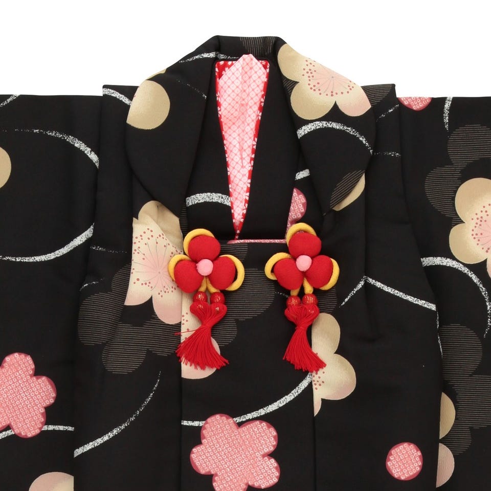 黒の地色に上品で粋な桜模様や鹿の子模様が、しとやかな雰囲気の被布セット。一見クールに見えそうで、胸元のふっくらと愛らしい被布飾りなど女の子らしいポイントで、グッと愛らしさがアップするちょっと大人っぽい組み合わせ。