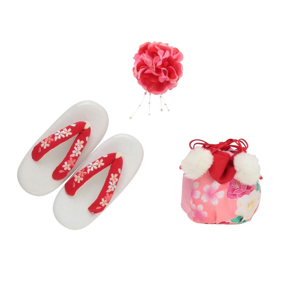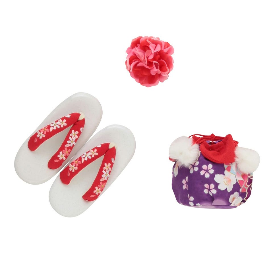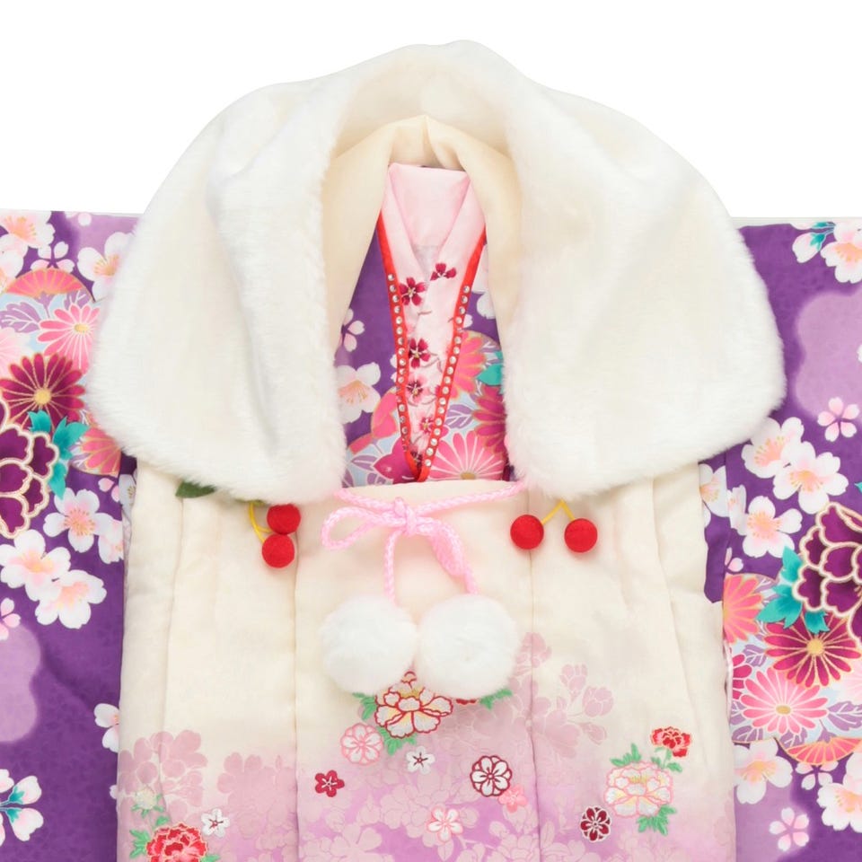 ・着物・被布コート・長襦袢(半衿つき)・肌襦袢・兵児帯(しごき)・ファー衿・腰ひも2本・足袋・草履・髪飾り・巾着