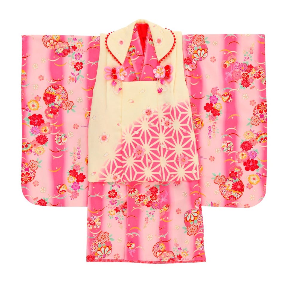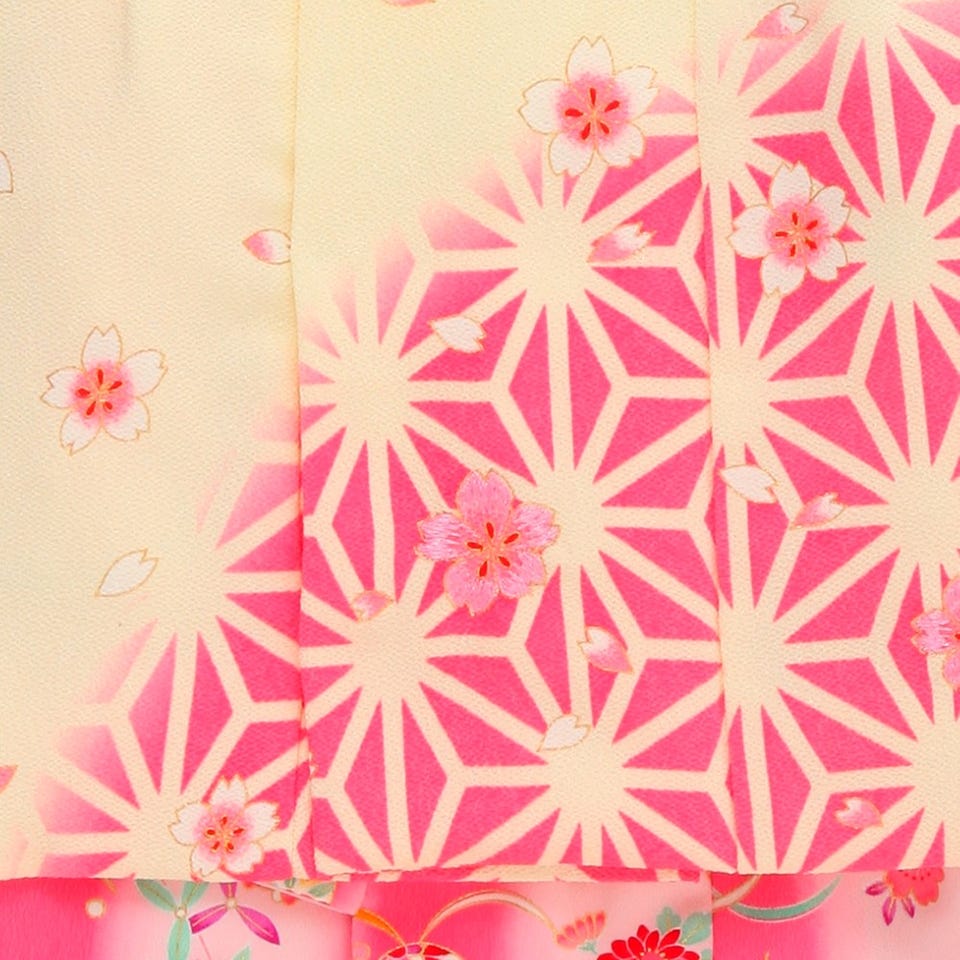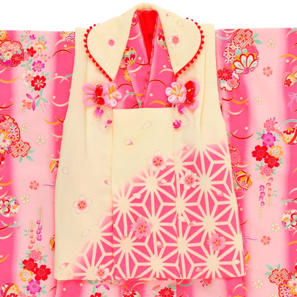 花夢二ブランドの七五三3歳用被布セット!桜色と濃いピンクのぼかしに日本らしい桜などの古典模様が愛らしい女児用被布セット。麻の葉模様のやわらかなクリームとピンクの被布コートの胸元には、女の子らしさをさらに引き立てる桜モチーフのお洒落な飾りがあしらわれています。