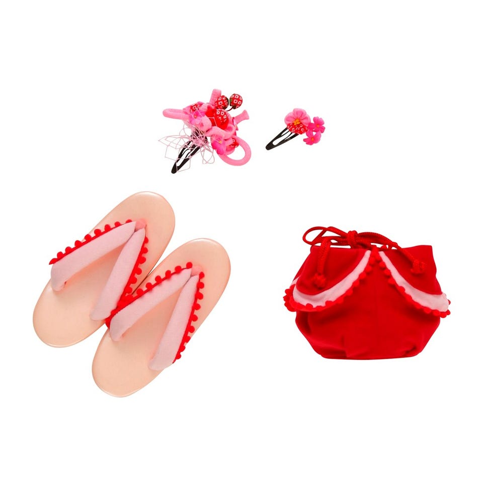 ・着物・長襦袢(半衿つき)・被布コート・兵児帯(しごき)・腰ひも2本・足袋・肌襦袢・髪飾り2種類・巾着・草履