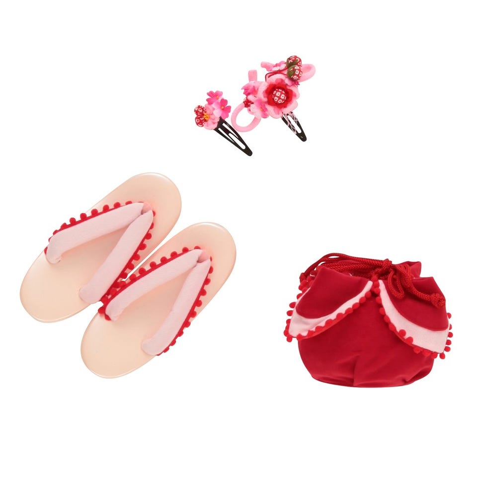 ・着物・襦袢・被布コート・兵児帯(しごき)・腰ひも2本・足袋・肌襦袢・髪飾り×2種類・巾着・草履