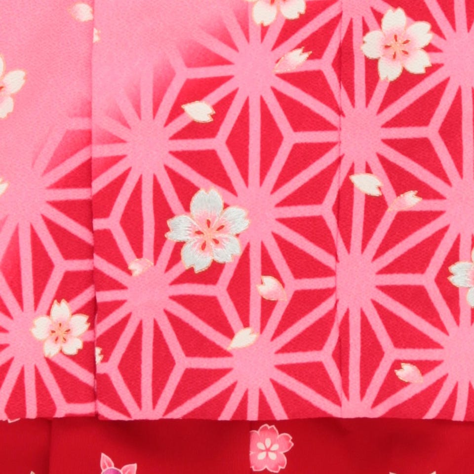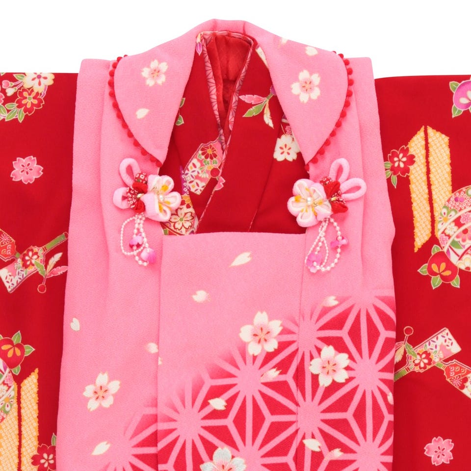 花夢二ブランドの七五三3歳用被布セット!魔除けになるお色として定番の朱赤色を基調に日本らしい花や鞠の古典模様をちりばめた華やかな女児用被布セット。麻の葉模様のピンクと赤の被布コートの胸元には、女の子らしさをさらに引き立てる桜モチーフのお洒落な飾りがあしらわれています。