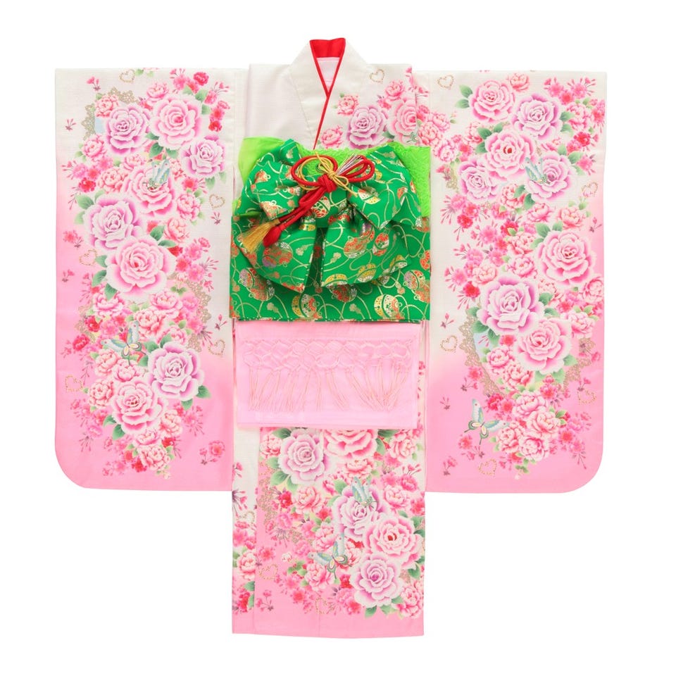 キューティデビィルの七五三7歳用着物セット!白地にピンクのぼかし、バラやハート・レースなどの現代風アレンジがとっても可愛い着物セット。鮮やかなグリーンの帯が全体を引き締める、とってもキュートな1品。