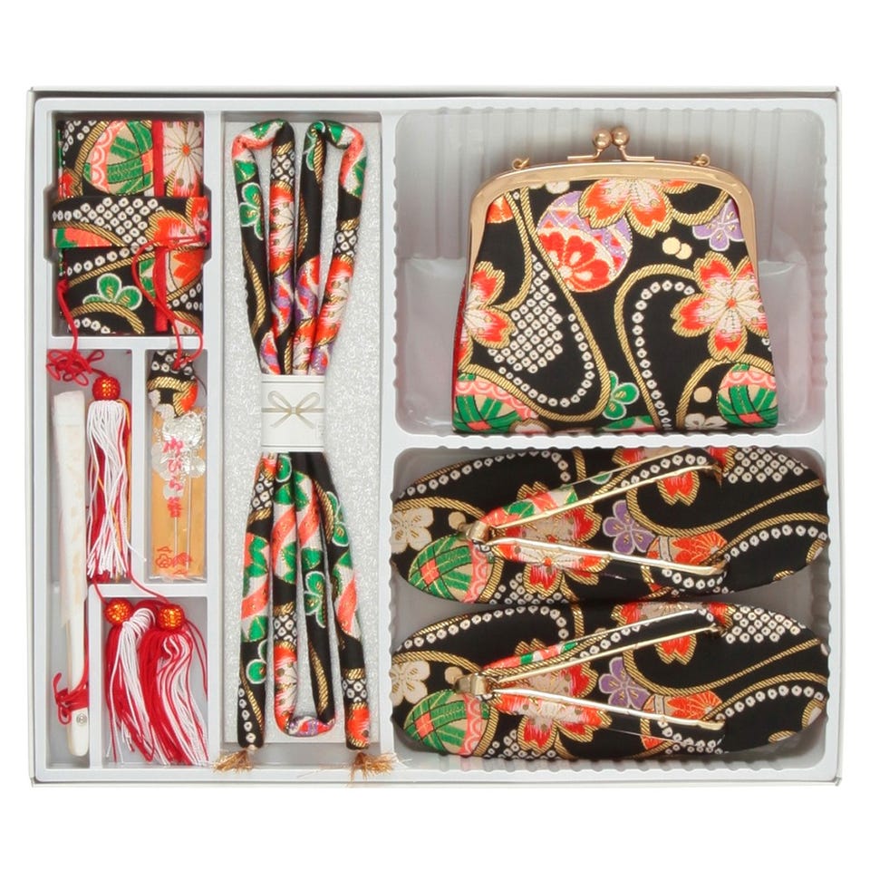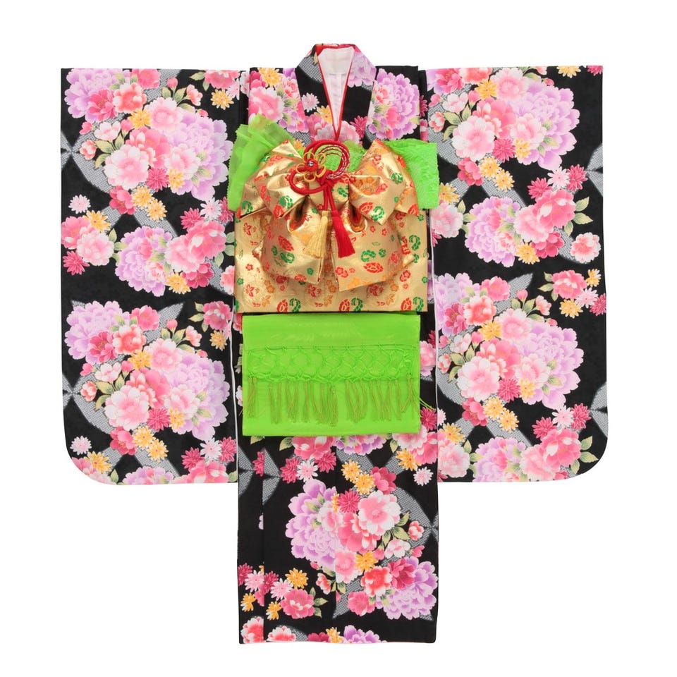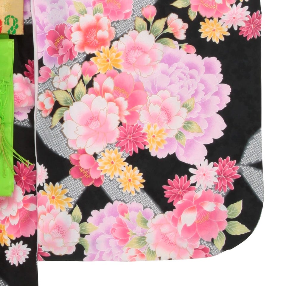 黒地に大輪の花々が彩る七五三7歳児用着物セット。結び帯(作り帯)のため簡単に着用が行えます。