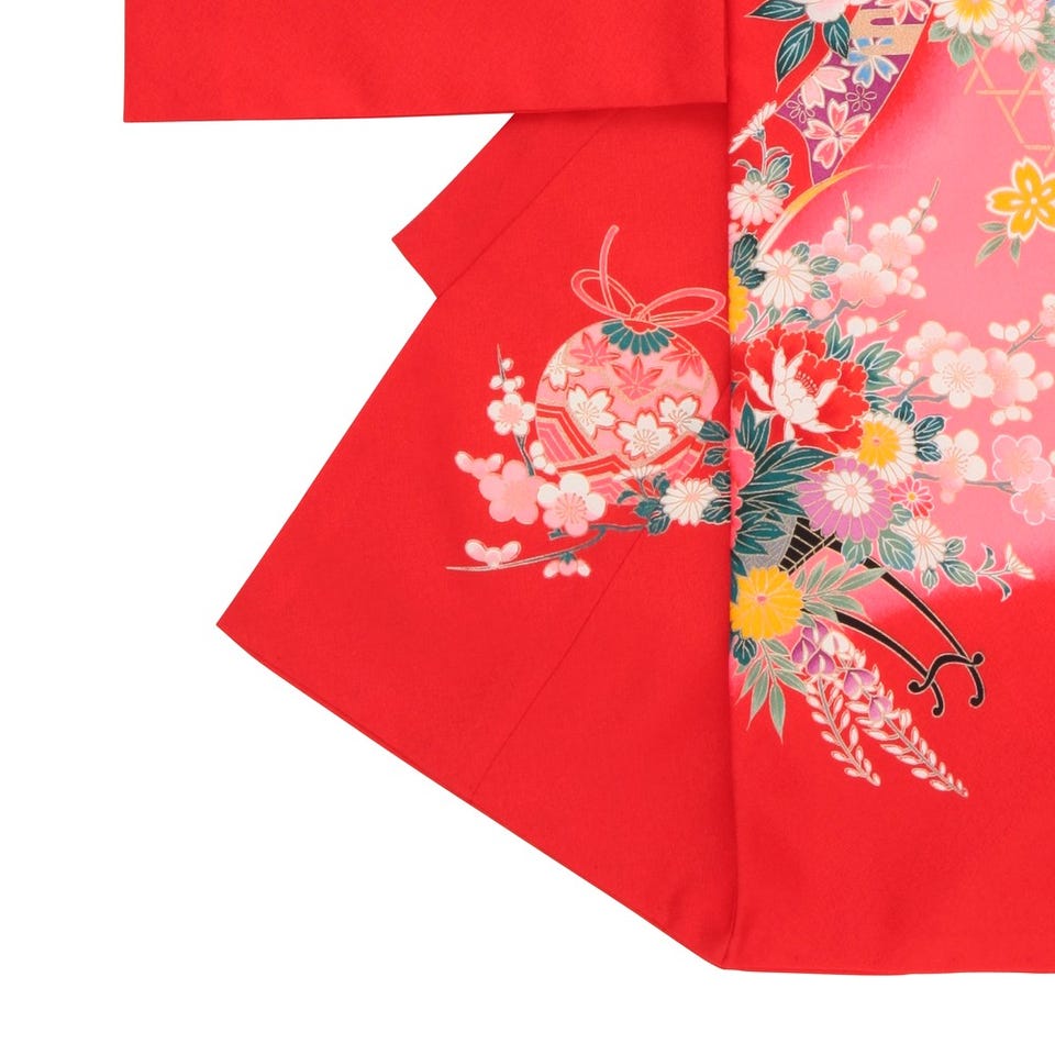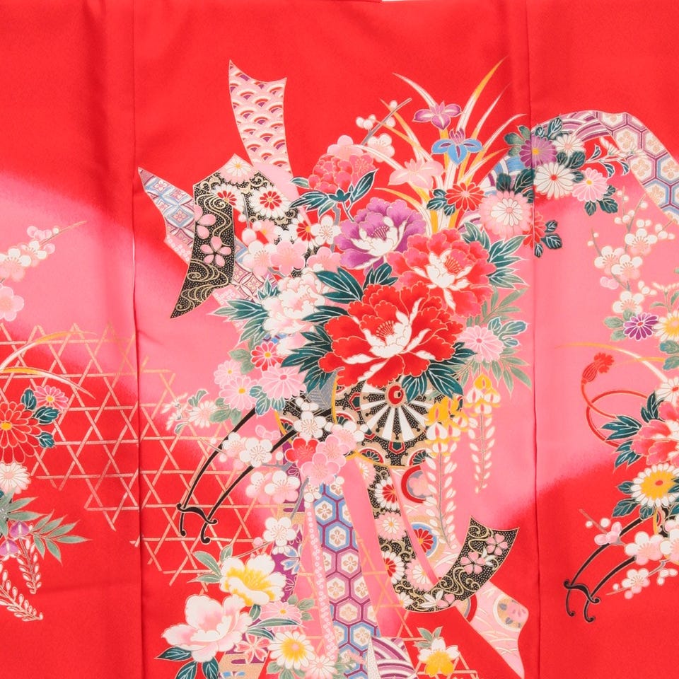 満開の牡丹が印象的でもあり、鞠、御所車がとても麗しく女の子の晴れの日にぴったりな1着となっています。