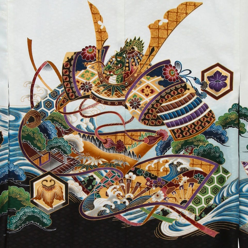 背中には大きな兜が描かれており、袴はゴールドで文様が描かれている七五三5歳児用袴セット。ベーシックなデザインで大変人気のある袴セットです!