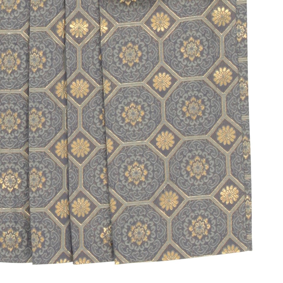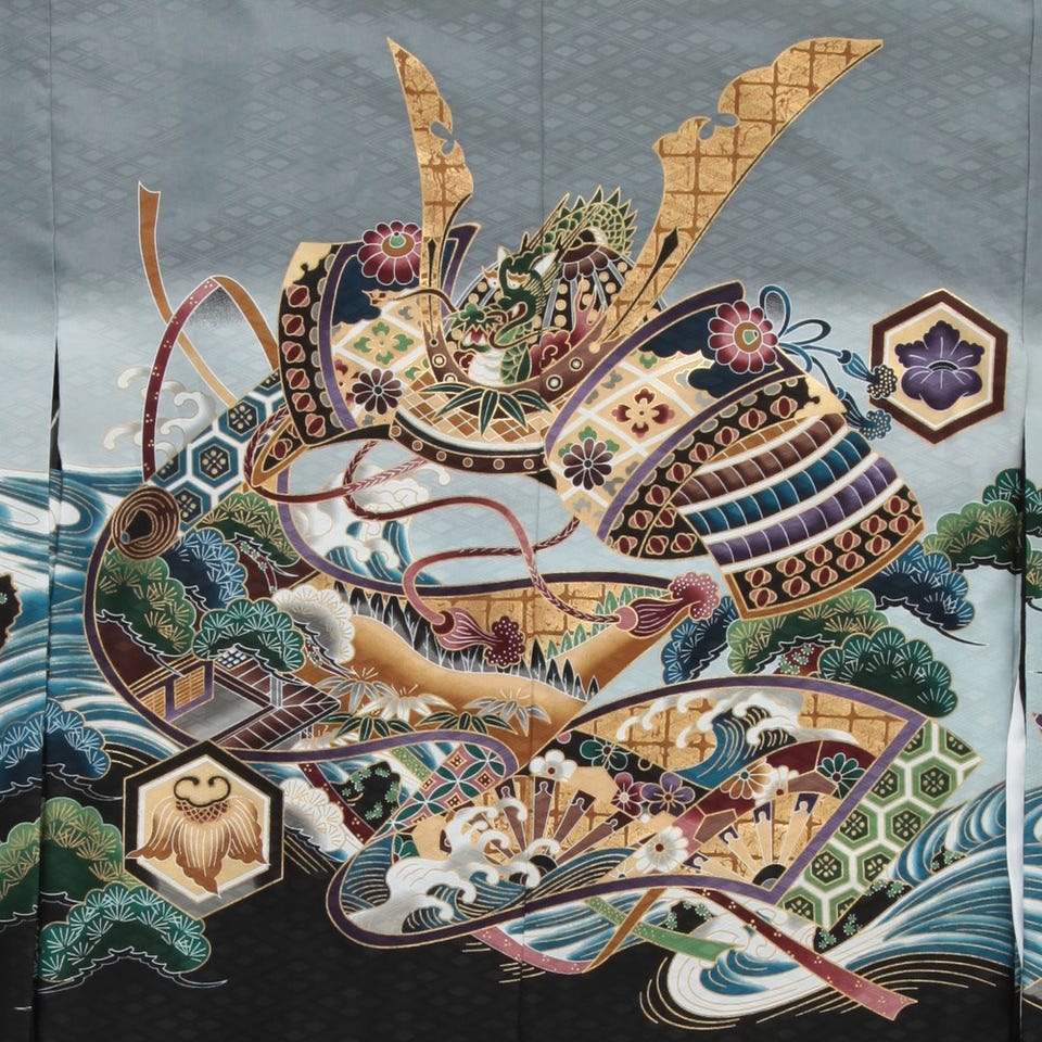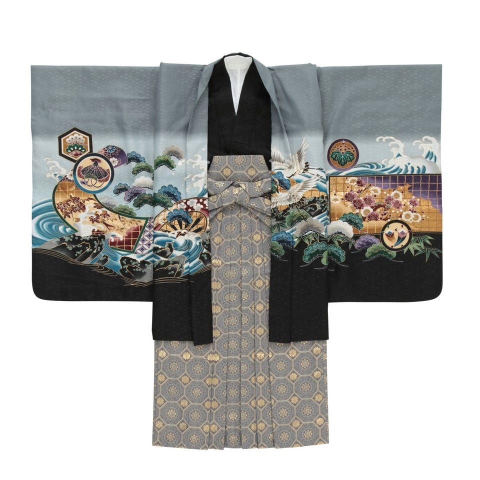 淡いグレーの生地に縁起の良いデザインが並んでいる5歳児用七五三羽織袴セットです。背中には兜がどっしりとした印象を与えます。