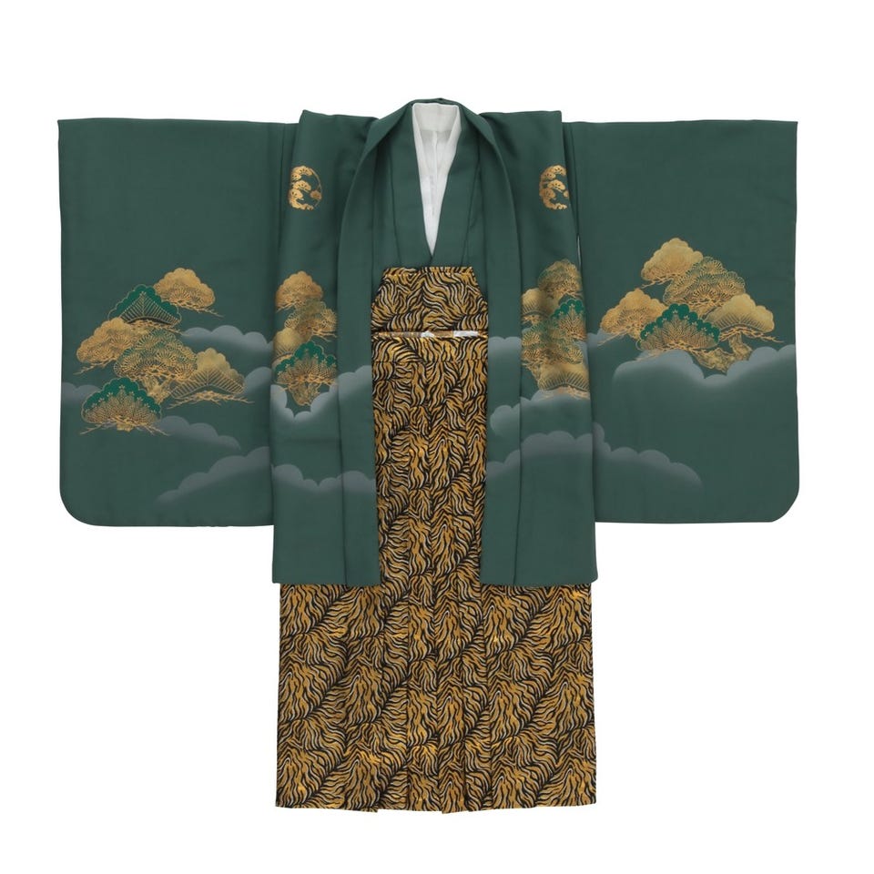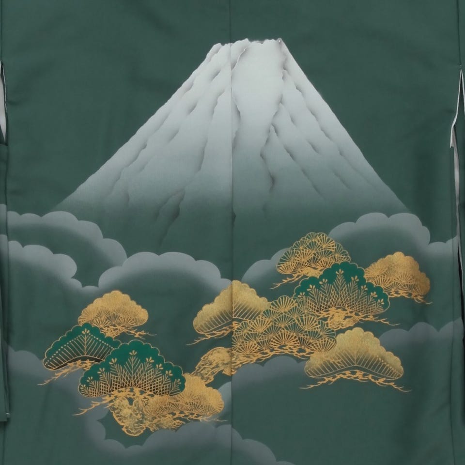 深緑を基調とした生地に富士山が何とも言えない雰囲気を醸し出している5歳児用七五三羽織袴セット。袴のデザインにもこだわり抜いた他にないワンランク上の衣装です。