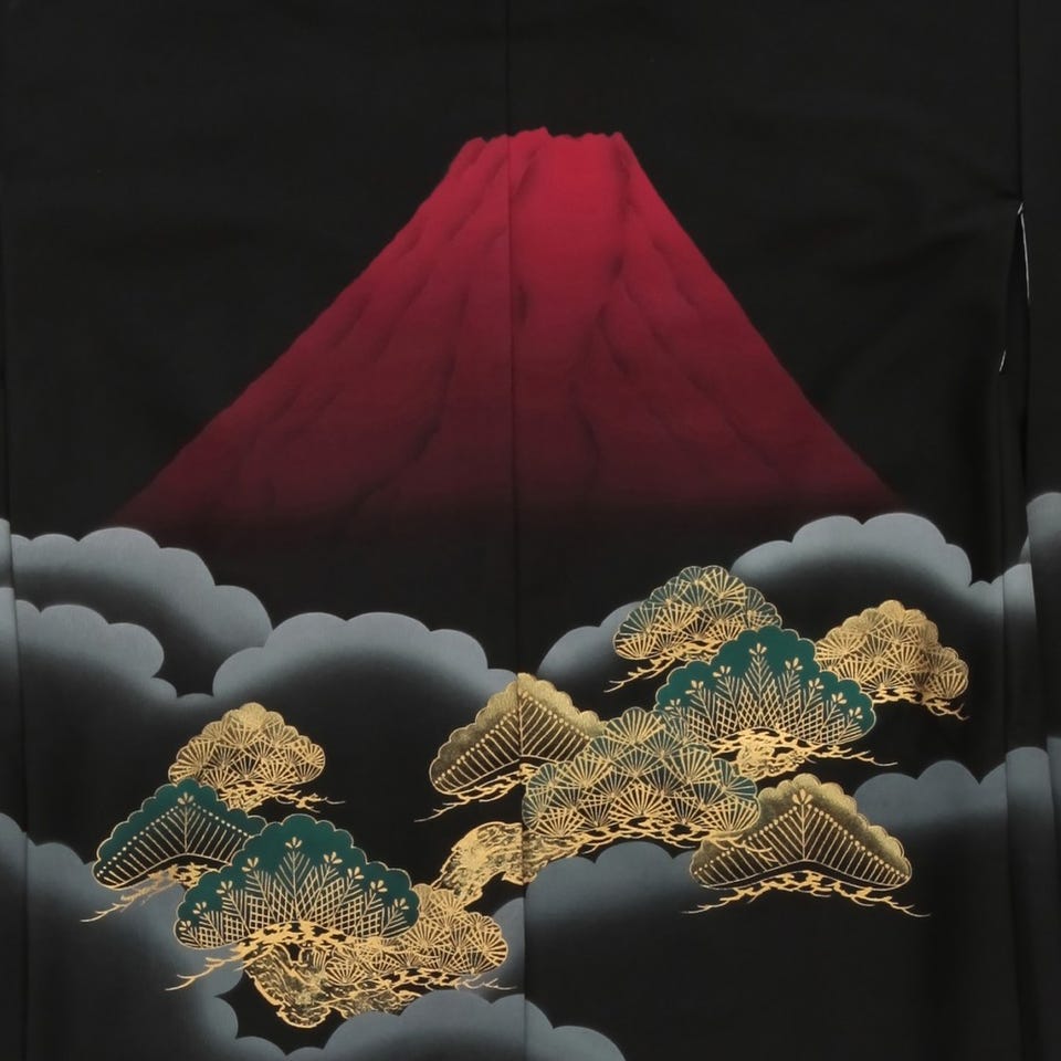 黒を基調とした生地に赤富士が何とも言えない雰囲気を醸し出している5歳児用七五三羽織袴セット。袴のデザインにもこだわり抜いた他にないワンランク上の衣装です。