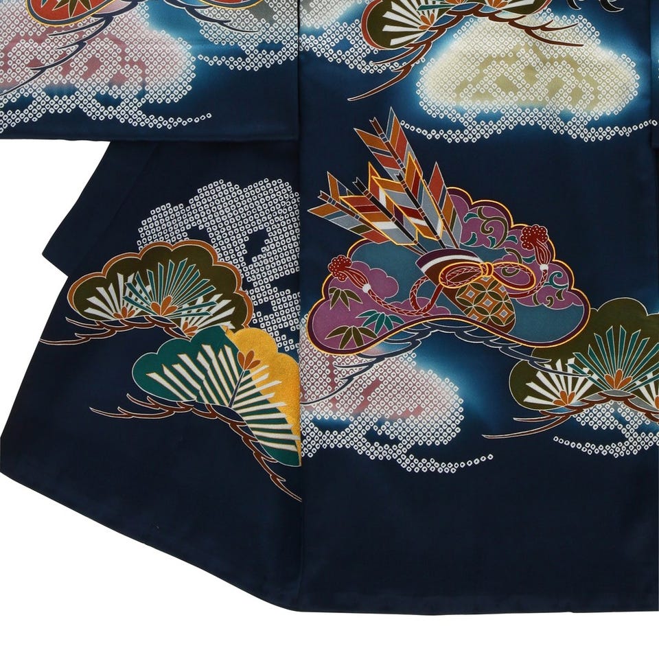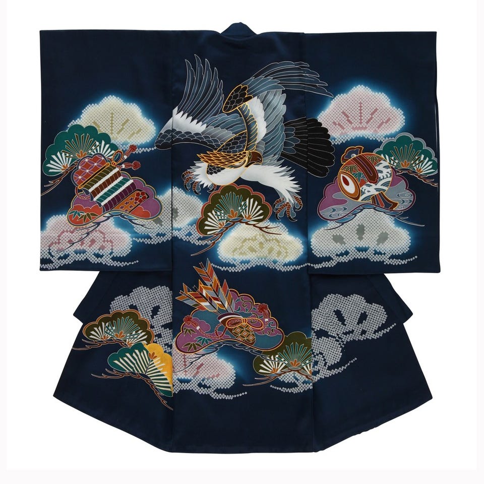 男の子 お宮参り 産着レンタル6点フルセット 正絹 鷹 扇 ネイビー