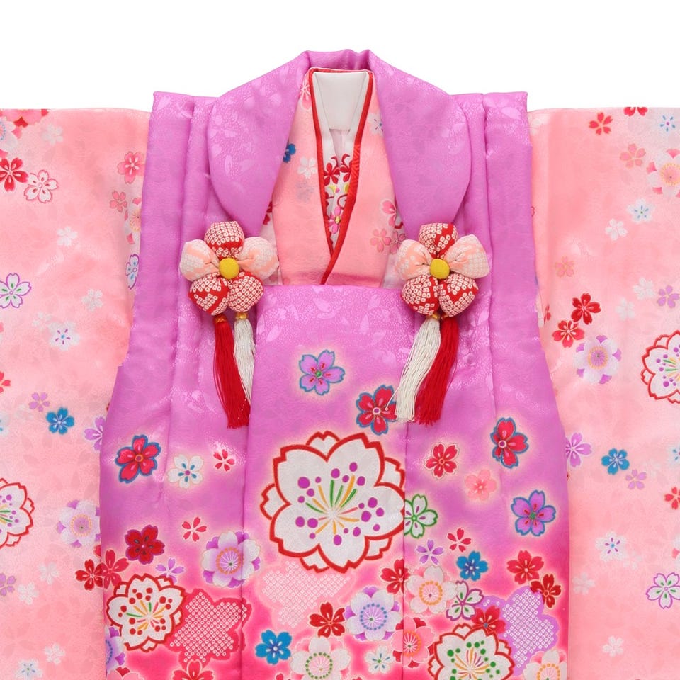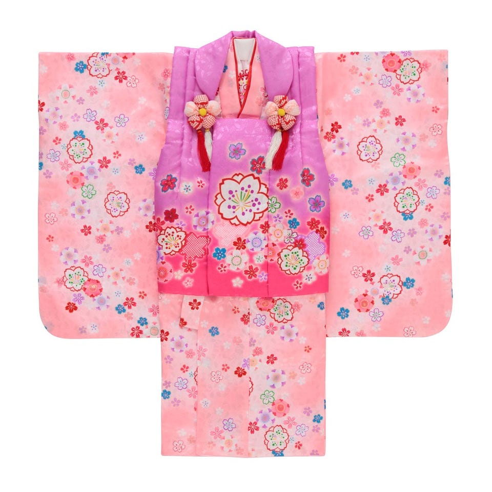女の子の着物柄に用いられる「梅」「桜」をモチーフに可愛らしい3歳女児用七五三被布セットになります。着物よりワントーン深みのある被布は紫色とピンクのグラデーションカラーになっており、立体感が出て写真撮影にもグッド!