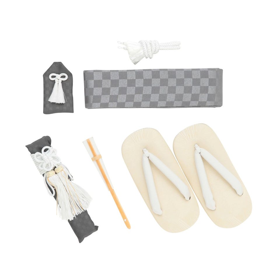 ・袴・羽織・襦袢(半衿つき)・羽織紐・角帯・腰ひも2本・足袋・懐剣・お守り・扇子・雪駄