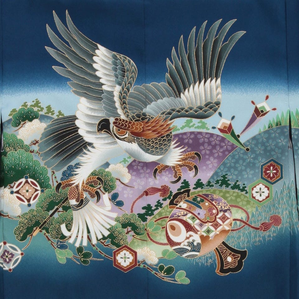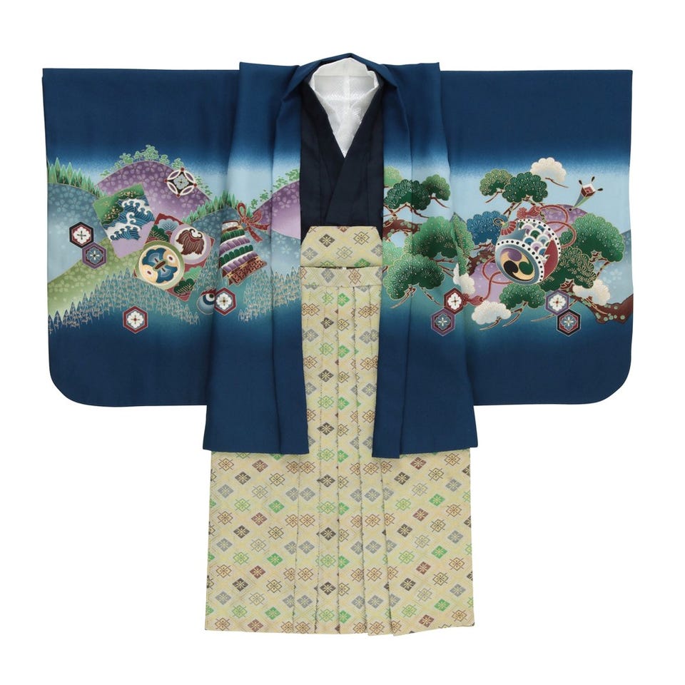 濃いブルー生地に松や鷹があしらわれた七五三5歳児用袴セット。袴との相性も良く、大変人気の袴セットとなります。必要なものはすべて揃っています!