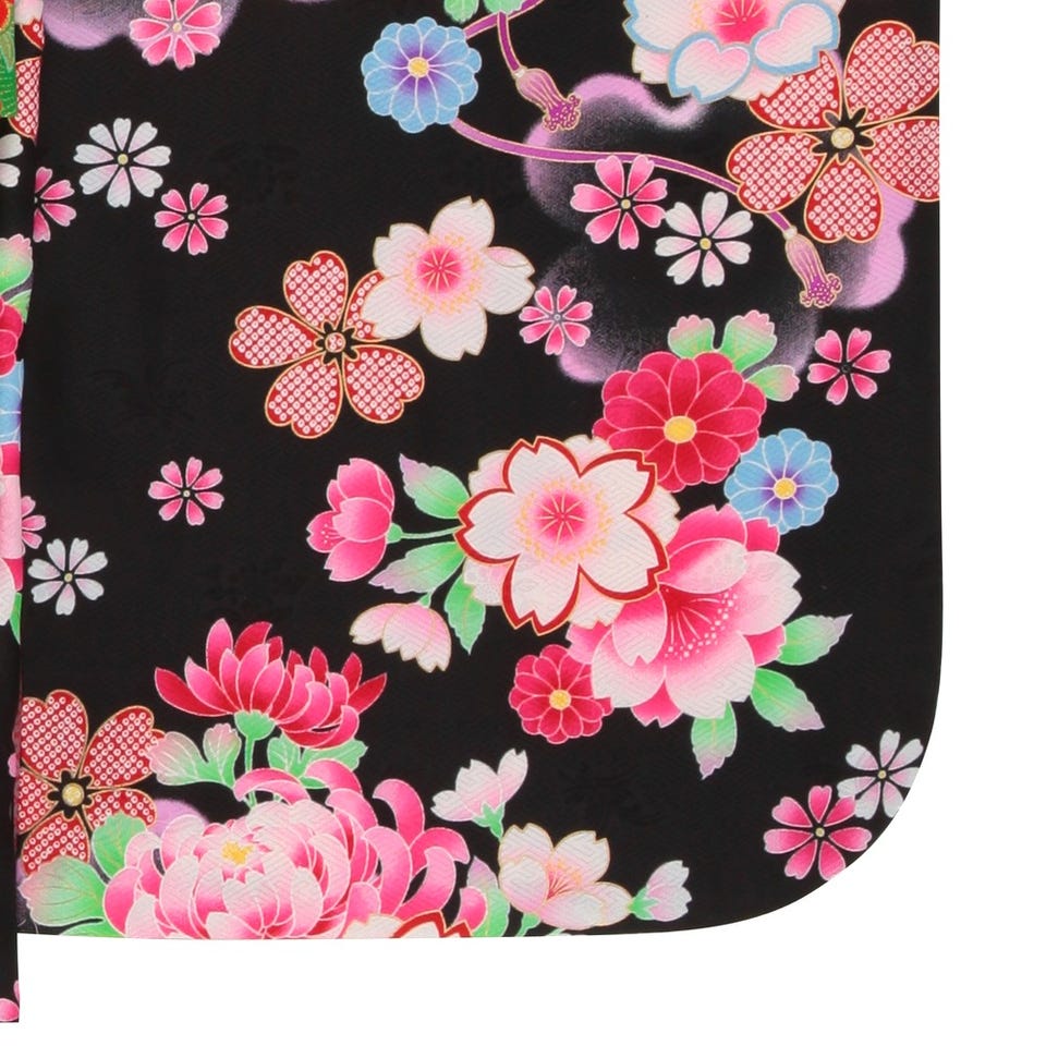 黒地に鮮やかなお花が目を惹く七五三7歳児用着物セット。結び帯(作り帯)のため簡単に着用が行えます。