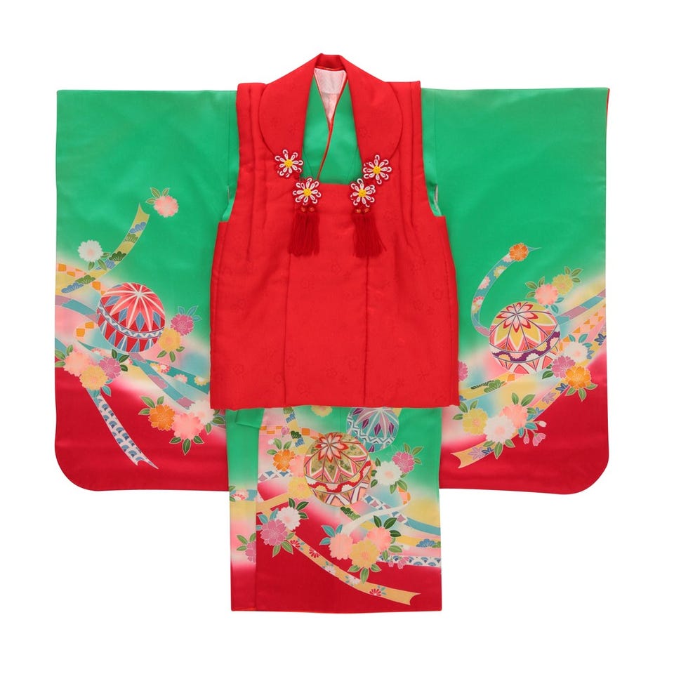 グリーンと赤地のお着物に鞠や牡丹など可憐に描かれている七五三3歳児用被布セット。こちらの商品には髪飾りが付属しておりませんので、希望される際は被布セットと合わせて「髪飾り」をご注文下さい。
