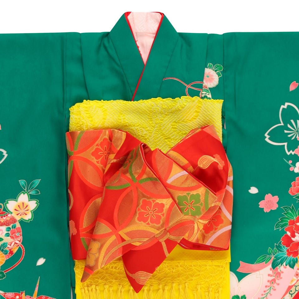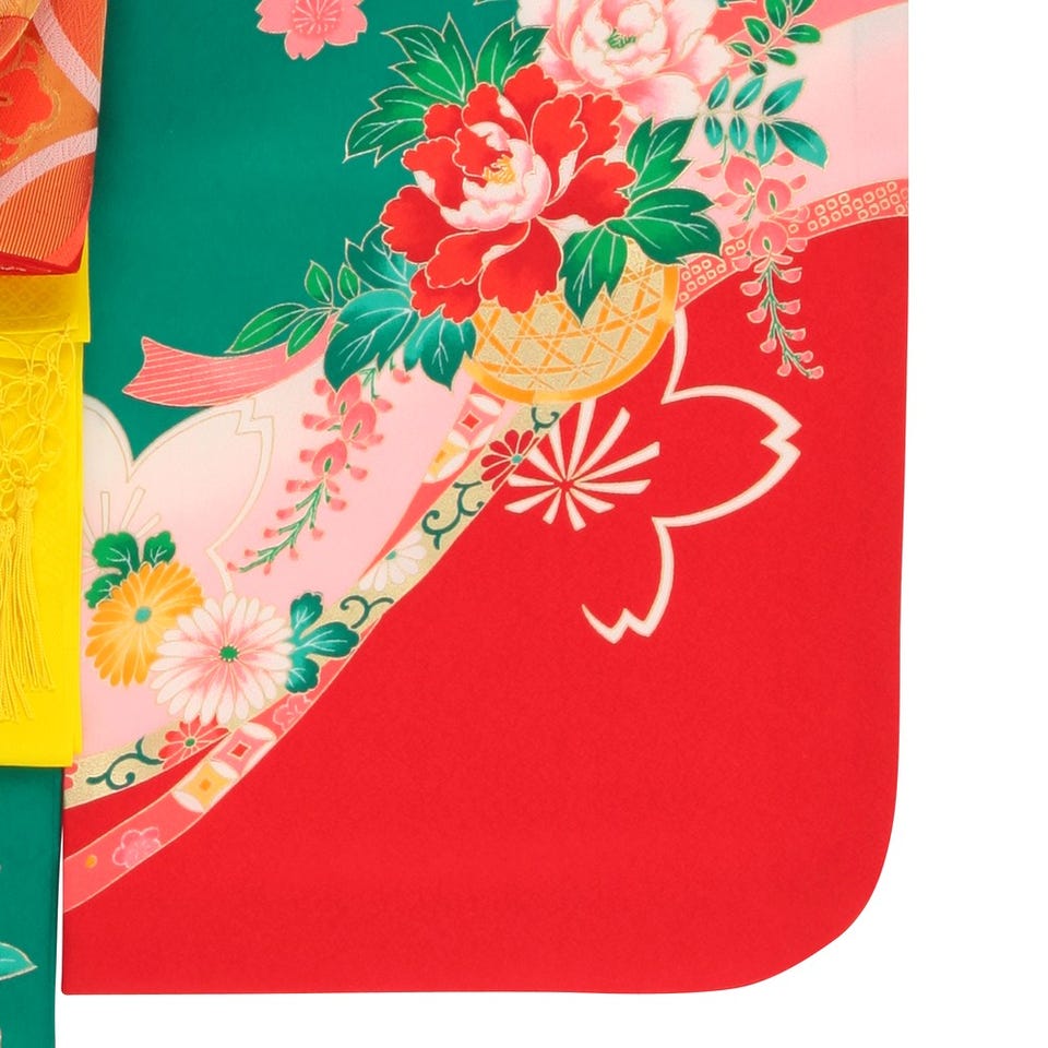 グリーンと赤が可憐な七五三7歳児用着物セット。赤や黄色の帯との相性が良く映えます。