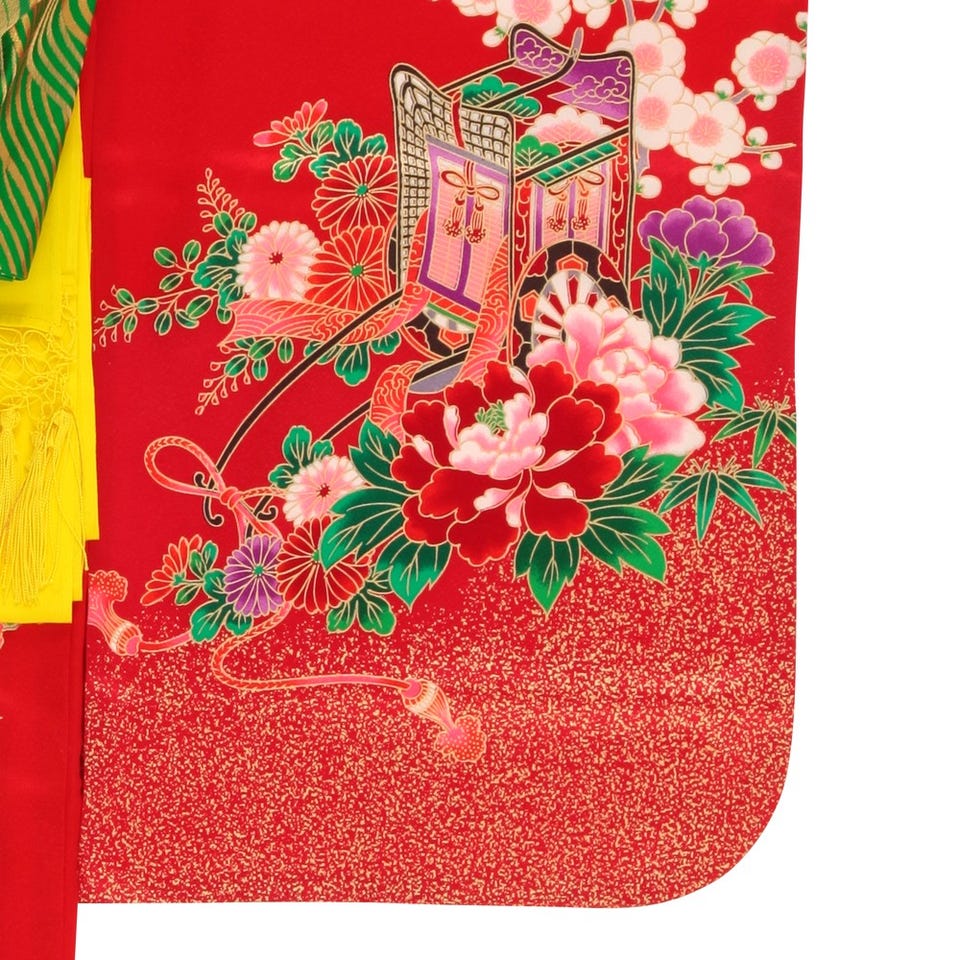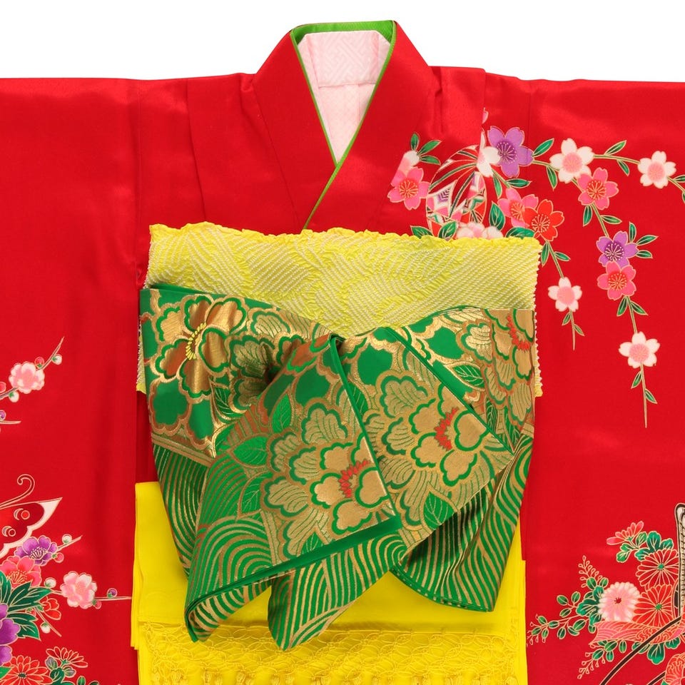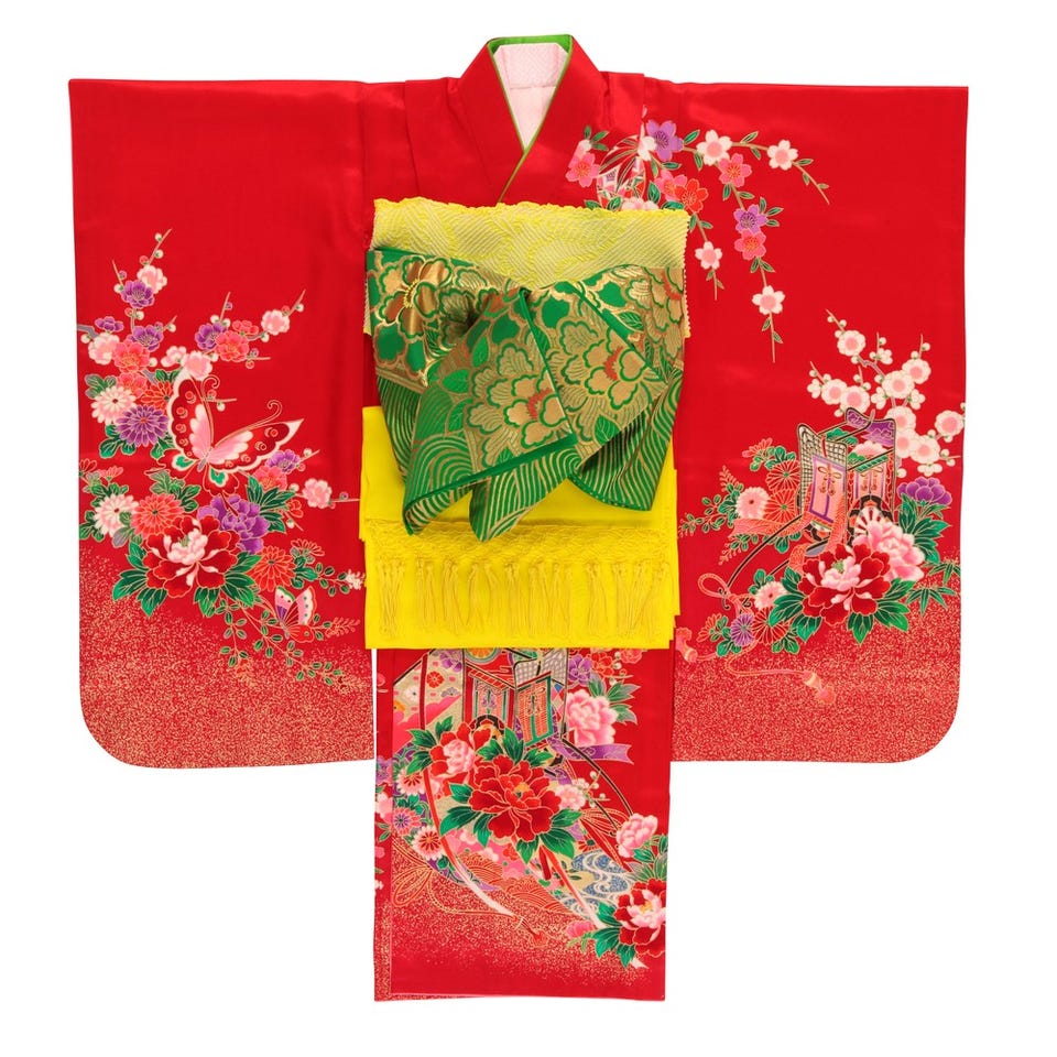 赤地に牡丹や蝶などあでやかな色彩が際立つ七五三7歳児用着物セット。グリーンや黄色の帯との相性が良く映えます。