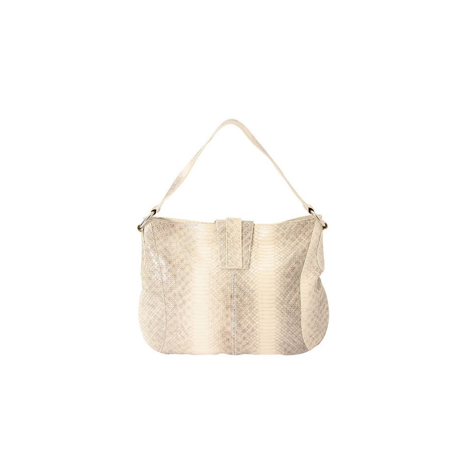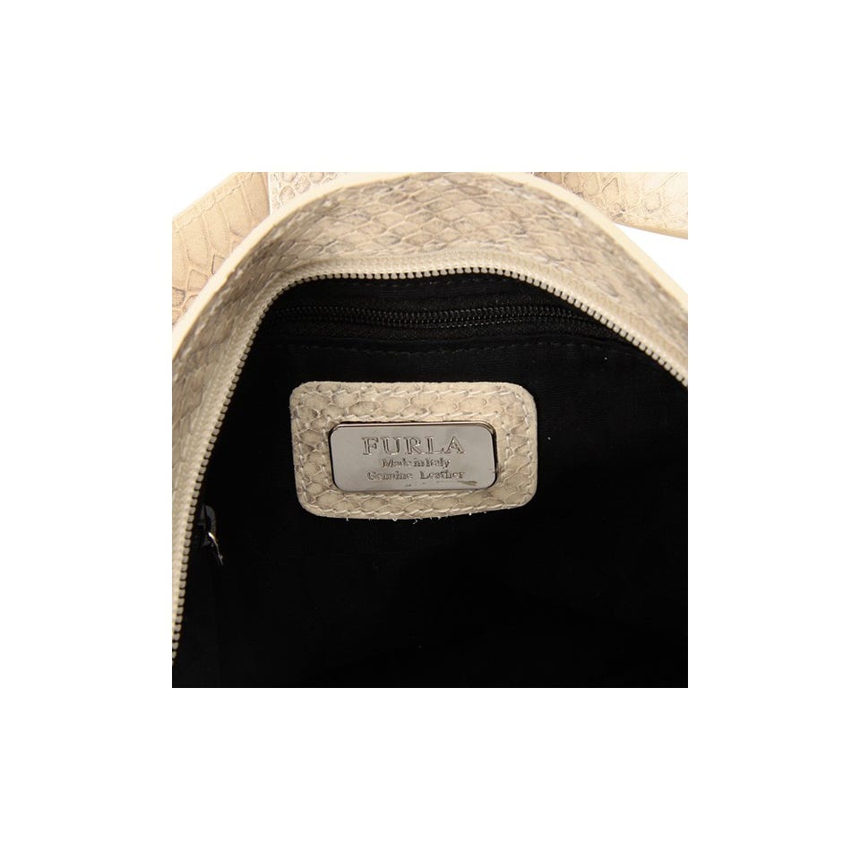 牛革にパイソンの型押しをほどこした「FURLA」のバッグ。シルバーのロゴプレートとリングがクールな輝きを放ちます。間口部分にファスナーが付いているので、中が見える心配もなし。薄型のフォルムなので持ち運びもしやすい。