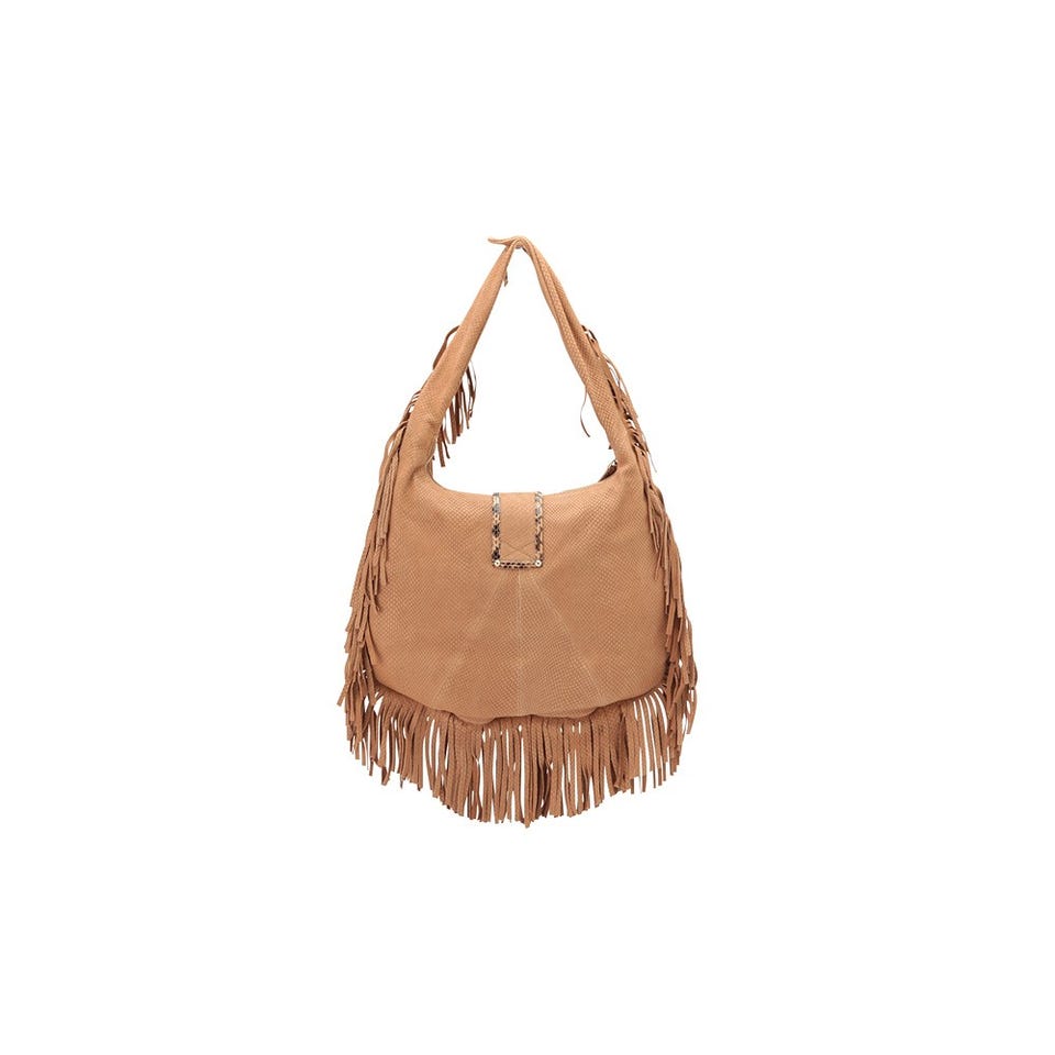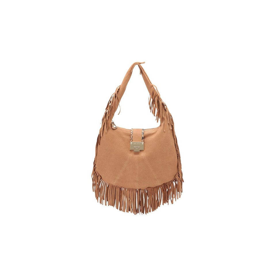 スエード素材にパイソンの型押しをほどこした「JIMMY CHOO」のバッグ。動くたびに揺れるフリンジが抜群の存在感を放ちます。A4判の雑誌が収まる大きさなので、デイリーユースに最適。