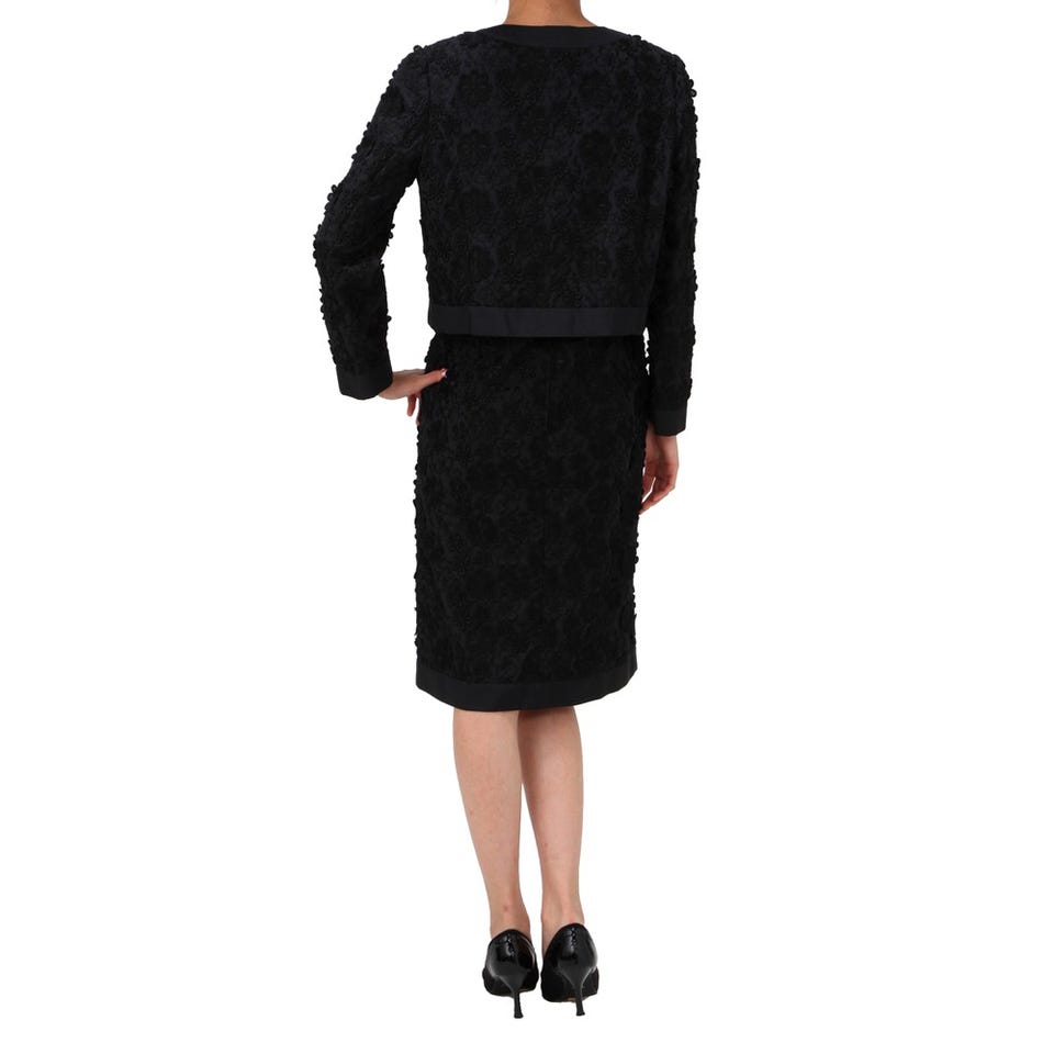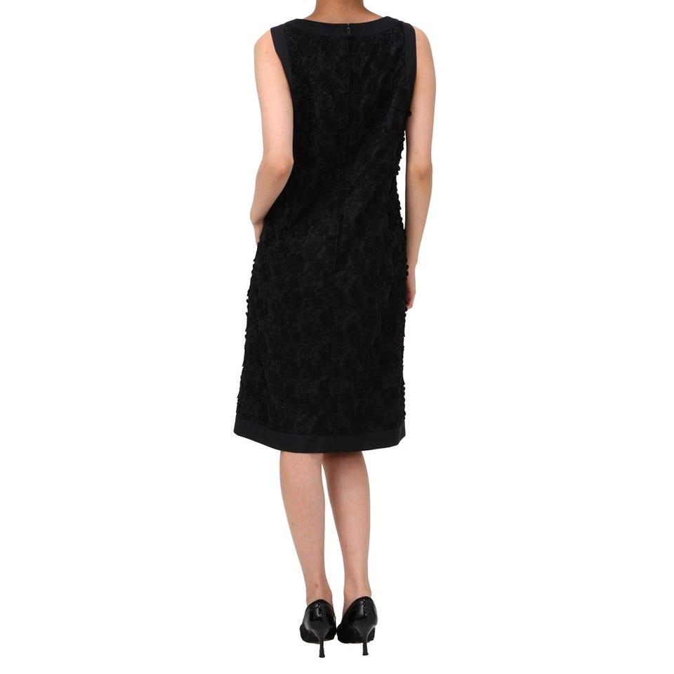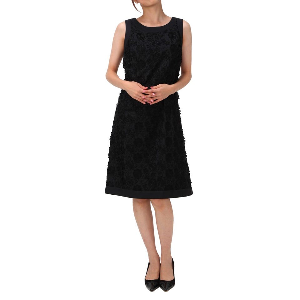 イギリスの高級百貨店「Harrods」のワンピーススーツ。花柄の刺しゅうを全面にあしらっているので、オールブラックでありながら華やかな雰囲気。コサージュはシーンに合わせて使い分けて。※掲載されているコサージュと実商品は異なります。ご了承ください。