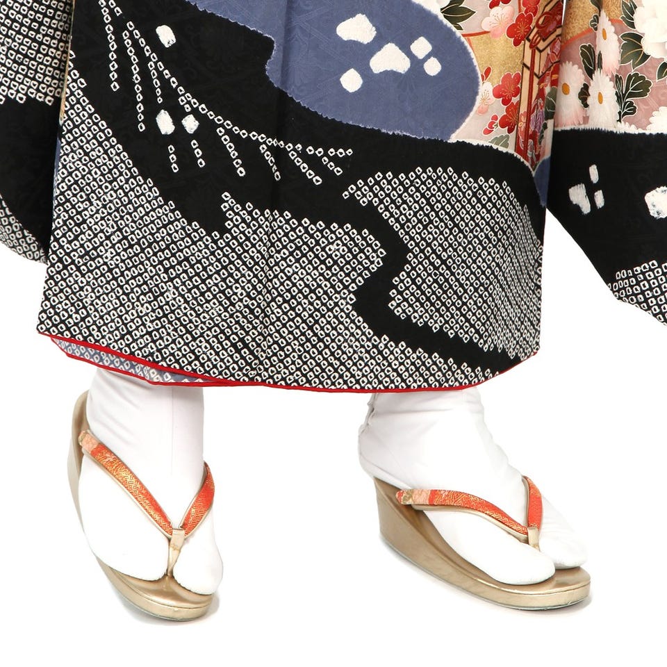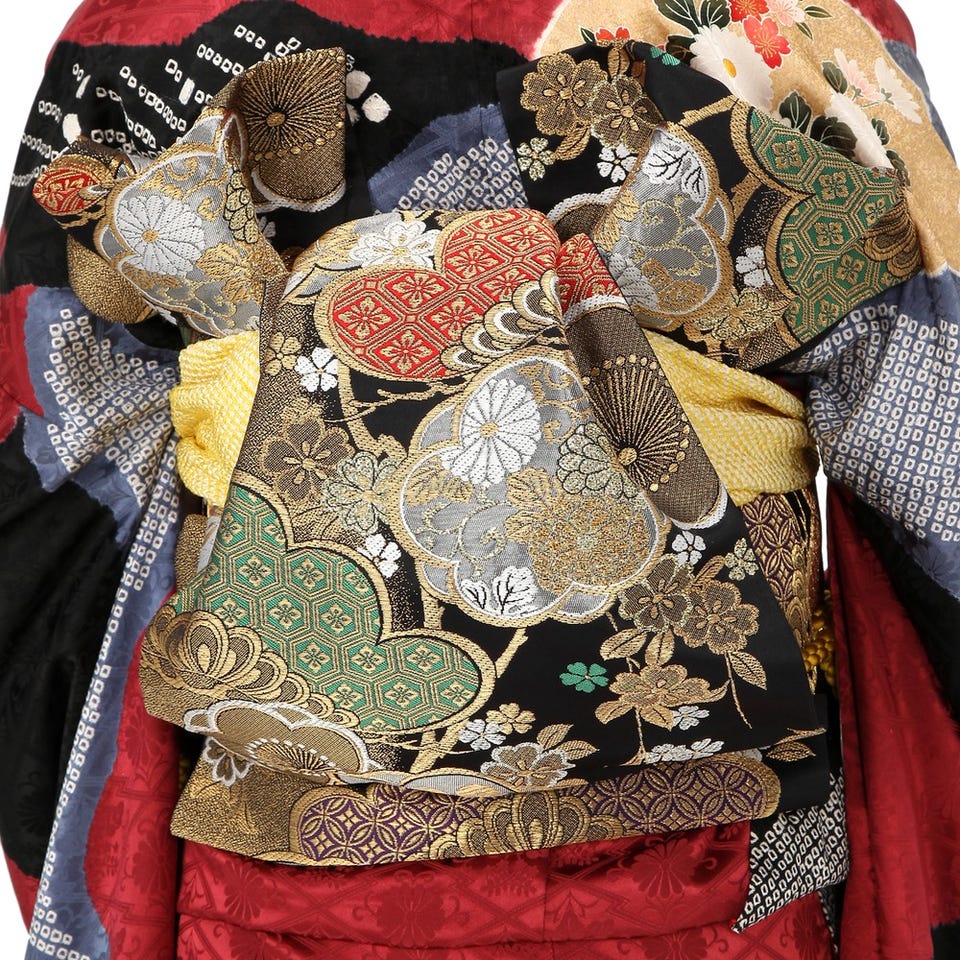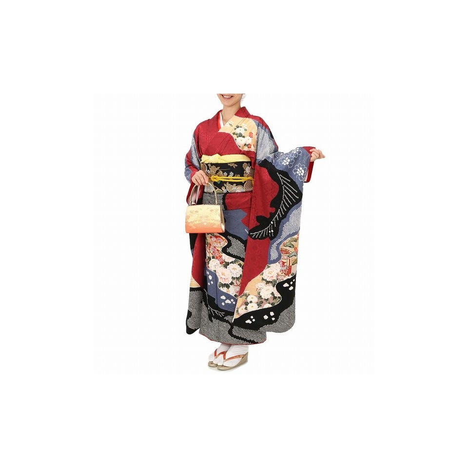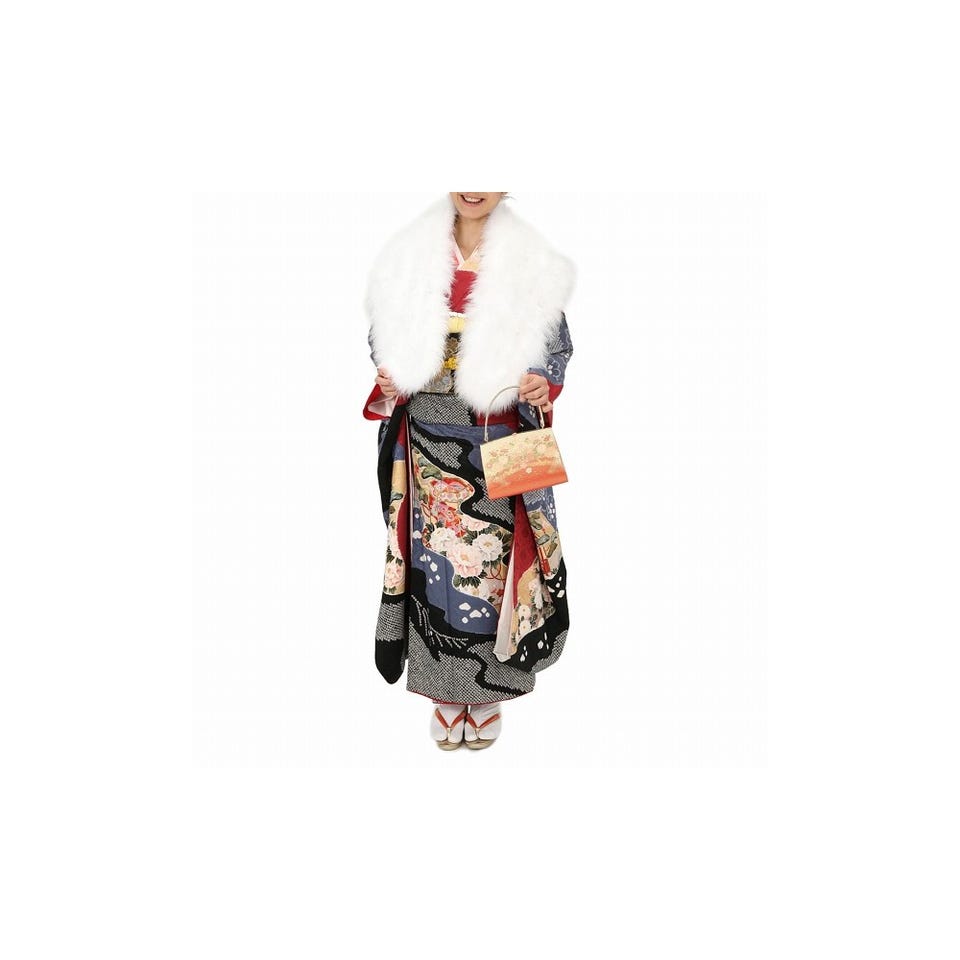 ところどころに小紋絞りのアクセントをあしらったボリューム感のある振袖です。地にははっきりとした黒や赤、紺といった色味を使い、大胆に花を描くことで華やかなデザインに仕上がっています。真っ白なファーショールをまとえばさらにエレガントな装いがお楽しみいただけます。※半衿はあらかじめ襦袢に縫製されております。※草履、バッグは商品画像と異なる場合がございます。※髪飾りはセットに含まれておりません。あらかじめご了承ください。