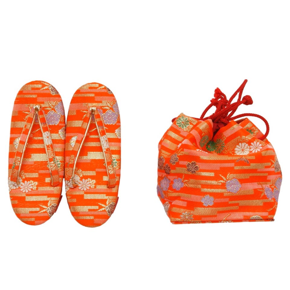 赤と紫という大人顔負けのシックな色合いとシンプルなデザイン。大人っぽく、そしてあえて色をそ ろえない草朱色の履と紫の巾着の風合いはより洗練されたお上品な装いになります。こちらの商品には髪飾りが付属しておりませんので、希望される際は被布セットと合わせて「髪飾り」をご注文下さい。