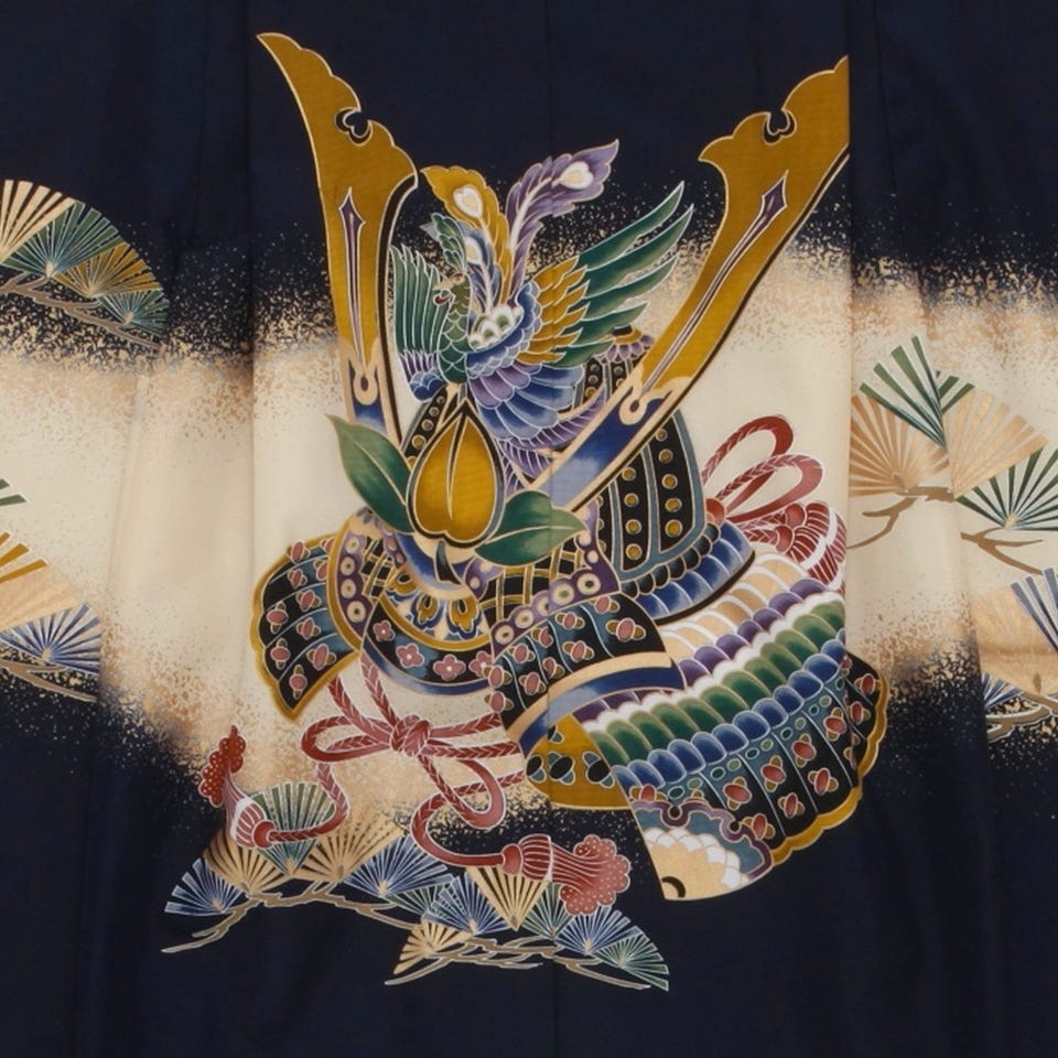 落ち着いたブルーにかぶとの絵柄は強くたくましく健康に育ってほしいという親の願いもかねた絵柄です。幼児から少年へと成長し、うつり行く姿をほほえましく感じられる素敵な装いになります。